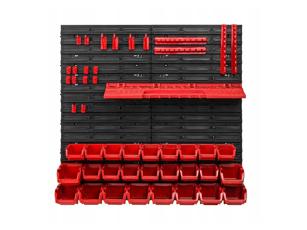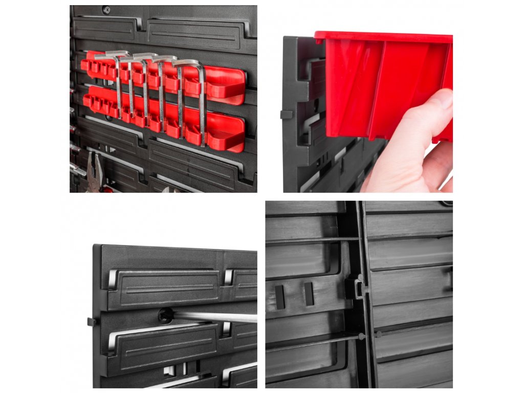 Stena o rozmere 780 x 780 mm poskytne dostatok priestoru na uloženie potrebného náradia, 26 úložných boxov, 1 policu na náradie a 20 držiakov náradia poslúži ako úložný priestor na náradie, skrutky, klince, matice alebo rôzne náhradné diely.
