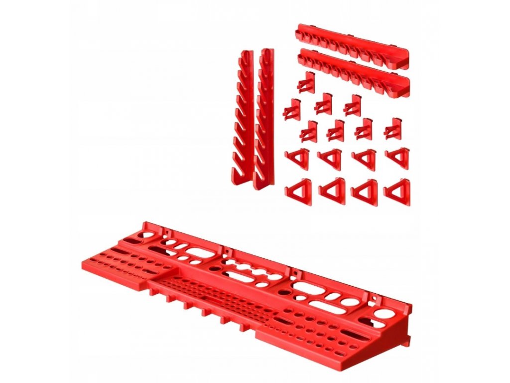 Držiaky/police na náradie: Jedným z najdôležitejších prvkov zostavy sú držiaky a police na náradie, horizontálne pripevnené k doske, umožňujúce prehľadné usporiadanie všetkých potrebných nástrojov. Nevyužitý priestor nad pracovnou doskou je ideálnym miestom pre policu na náradie pričom poskytuje prístup na dosah ruky.