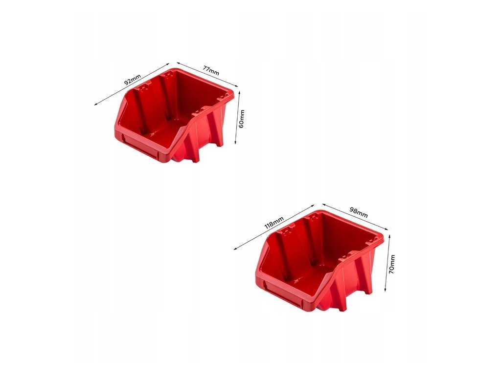 Úložné boxy: Táto stena na náradie je vybavená aj úložnými boxami. Vďaka ich využitiu bude vždy zachovaný poriadok v práci. Súčiastky od seba jednoducho a efektívne odlíšite pomocou štítkov, pre ktoré majú boxy vyhradené miesto na prednej strane. Zostava obsahuje 26 ks boxov červenej farby, s rozmermi: 10ks 98 x 118 x 70 mm a 16 ks 77 x 92 x 60 mm.