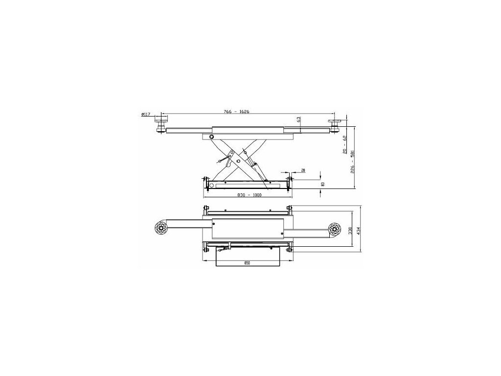 lifting capacity: 2500 kg • height [A]: 641 mm, • support width: 766-1626 mm, • rollers width: 830-1000 mm, • supply: 6-10 bar.