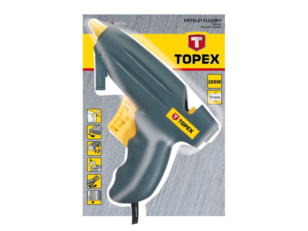 Lepiaca pištoľ TOPEX (ref. 42E521) na lepidlo s priemerom 11,2 mm, 200 W. Šikovný kryt a pohodlná rukoväť znižujú námahu pri práci. Tepelne odolné puzdro. Lepiaci hrot na presné nanášanie lepidla. Výkon lepidla 12 g/min. Ideálne pre dielne domácich majstrov, ako aj pre profesionálne aplikácie, ako je oprava kobercov, výroba nábytku. Súlad s európskymi bezpečnostnými normami zaručuje certifikát CE. Značka TOPEX je určená pre domácich majstrov.
