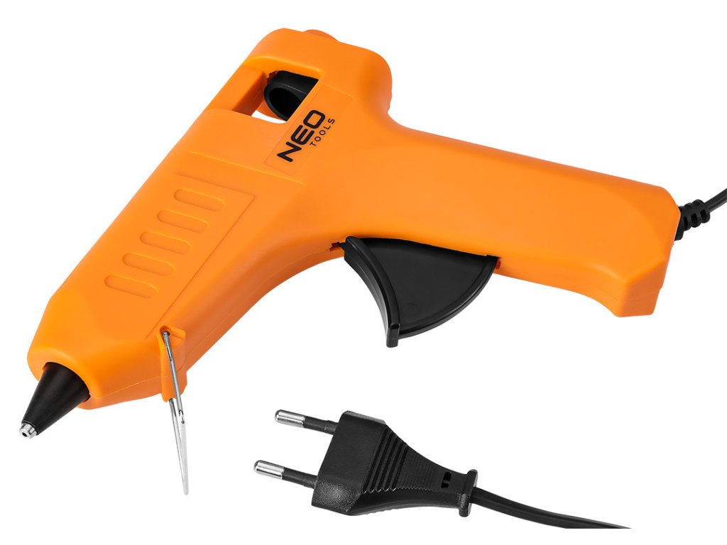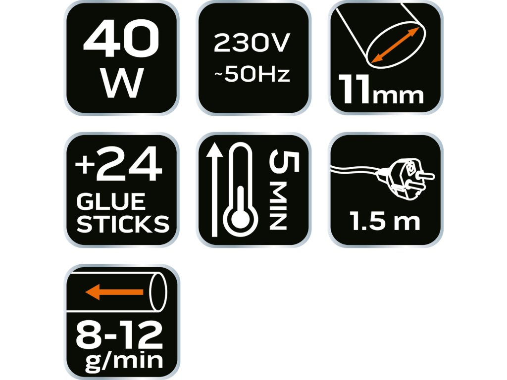 Priemer lepiacej pištole 11 mm, 40 W, napájanie 230 V, 50 Hz, výkon 8-12 g/min, certifikát CE, podporný stojan, 24 kaziet, farba transparentná, kábel H03VVH2-F 2 x 0,5 mm, dĺžka kábla 0,75 m, hmotnosť 0,19 kg, rozmery 163x30x142, čas ohrevu 5 min, materiál tela plast