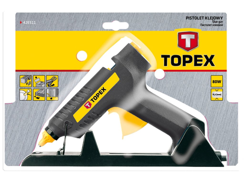 Lepiaca pištoľ TOPEX (ref. 42E511) na lepidlo s priemerom 11,2 mm s výkonom 80 W. Akumulátorová pištoľ umožňuje pracovať na miestach, kde nie je prístup s káblom, napríklad pri práci na rebríku. Praktický kryt a pohodlná rukoväť znižujú námahu potrebnú na prácu. Tepelne odolné puzdro. Lepiaci hrot na presné nanášanie lepidla. Výkon lepidla 14-16 g/min. Ideálne pre dielne domácich majstrov, ako aj pre profesionálne aplikácie, ako je oprava kobercov, výroba nábytku. Súlad s európskymi bezpečnostnými normami zaručuje certifikát CE. Značka TOPEX je určená pre domácich majstrov.