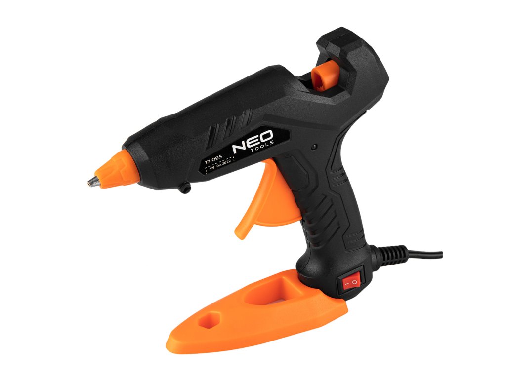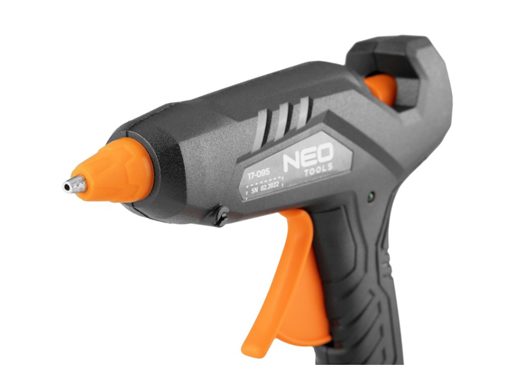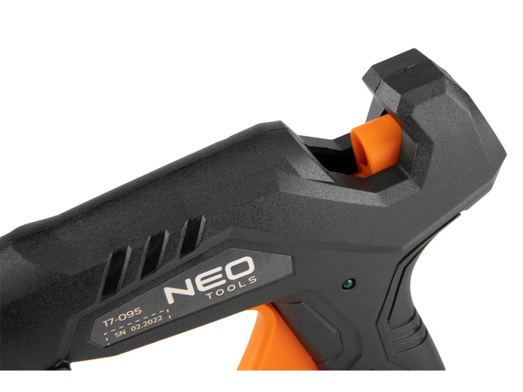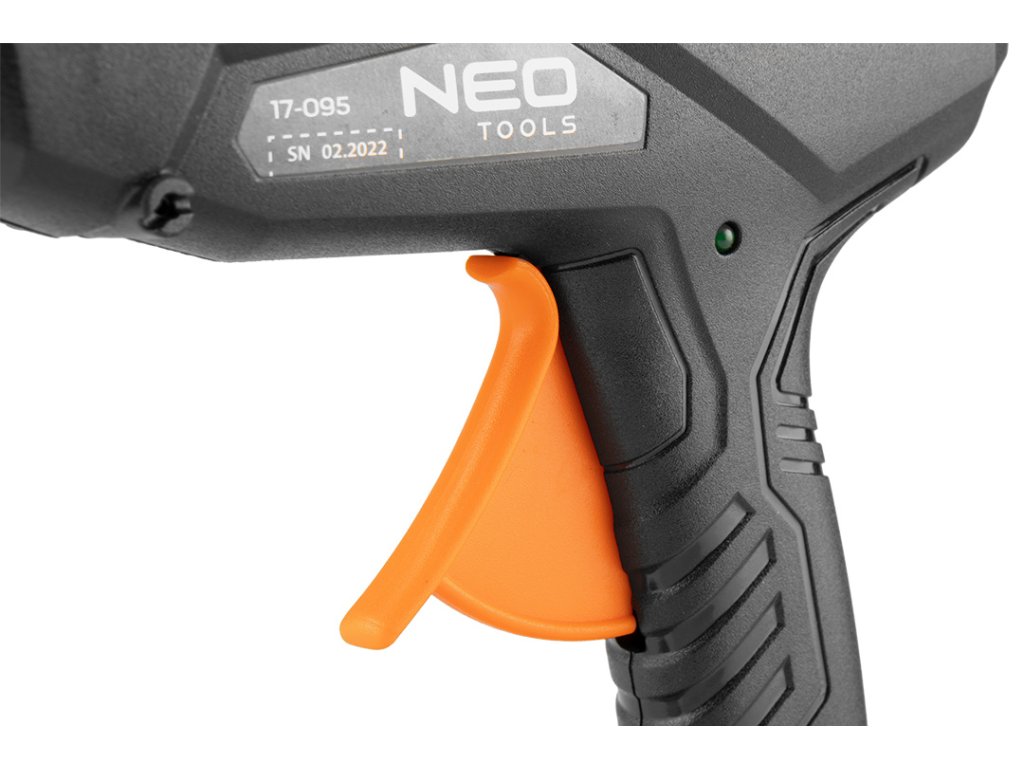 Lepiaca pištoľ NEO (ref. 17-095) na lepidlo s priemerom 8 mm, s výkonom 30 W. Pištoľ vďaka vysokému výkonu a pracovnej teplote rozpúšťa lepidlo rýchlejšie. 2-3-krát rýchlejšie roztápanie lepidla ako pri práci so štandardnou pištoľou. Ergonomická dlhá spúšť navrhnutá na zníženie námahy pri práci a zvýšenie efektivity spotreby lepidla. Tepelne odolné puzdro. Kovový hrot bez kvapkania na presné nanášanie lepidla. Ideálne na profesionálne použitie, ako je výroba nábytku, upevňovanie kobercov. Vysoký výkon lepidla 22 g/min. Certifikát CE zaručuje súlad s európskymi bezpečnostnými normami. Certifikát TÜV Rheinland zaručuje vysokú kvalitu a spoľahlivosť výrobku. Značka NEO spĺňa očakávania profesionálov.