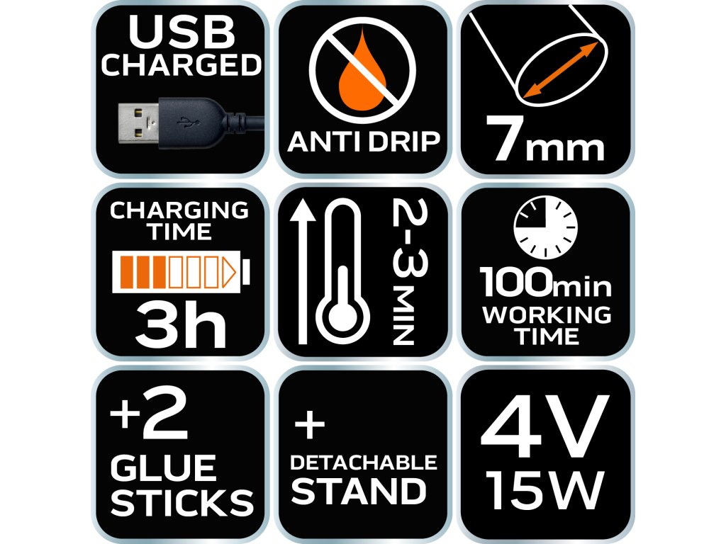Akumulátorová lepiaca pištoľ, 4 V, napájanie USB. Vhodné pre 8 mm lepiace kazety. Je vybavený lítiovou batériou s kapacitou 2600 mAh. Čas nabíjania približne 3 h. Prevádzkový čas približne 100 min. Výkon lepidla 360-600 g/h.
