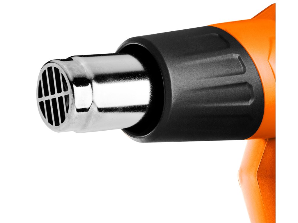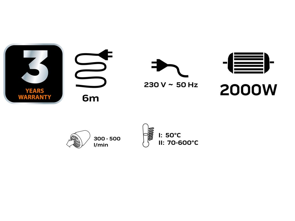 Teplovzd. pištoľ 2000W, teplotný rozsah: I: 50?C, II: 70-600?C, prietok vzduchu I: 300 - 500 l/min, (DxV) 250 x 190 mm, hmotnosť 0,77 kg, príslušenstvo: 4 trysky, škrabka s rukoväťou, kufrík