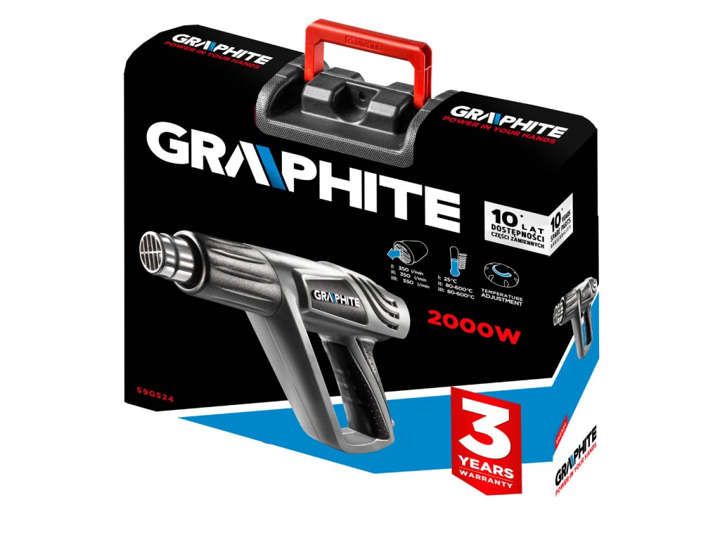 Vysoko kvalitná elektrická teplovzdušná pištoľ GRAPHITE s vysokým výkonom 2000 W je určená na odstraňovanie náterov, olejových farieb, lakov, ohýbanie a zváranie termoplastov, rozmrazovanie, sušenie a dyhovanie nábytkových dielov. Nástroj je vybavený štvorpolohovým spínačom, pomocou ktorého môžete vybrať jednu z troch úrovní teploty a prietoku odpadového vzduchu. Navyše na druhom a treťom behu existuje možnosť plynulej regulácie teploty. Rozsah teplôt: I: 25 ?C, II: 80-600 ?C, III: 80-600 ?C. Teplovzdušná pištoľ je ľahká a pohodlná, má rukoväť potiahnutú protišmykovým materiálom - dobre padne do ruky. Konštrukcia zariadenia umožňuje nastaviť teplovzdušnú pištoľ do zvislej polohy. Teplovzdušná pištoľ má tepelné zabezpečenie na opakované použitie, aby sa zabránilo náhodnému prehriatiu. Zariadenie je vybavené pružným a odolným napájacím káblom v gumovom obale s dĺžkou 3 m, ktorý je tiež určený na profesionálne a priemyselné použitie tak v interiéri, ako aj v exteriéri. V sade sú okrem pištole ďalšie trysky a škrabka s rukoväťou. Súlad s európskymi bezpečnostnými normami potvrdzuje certifikát CE.