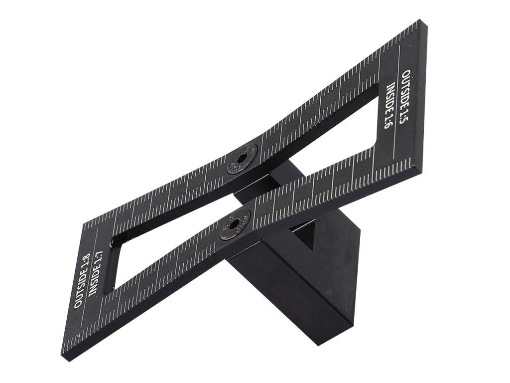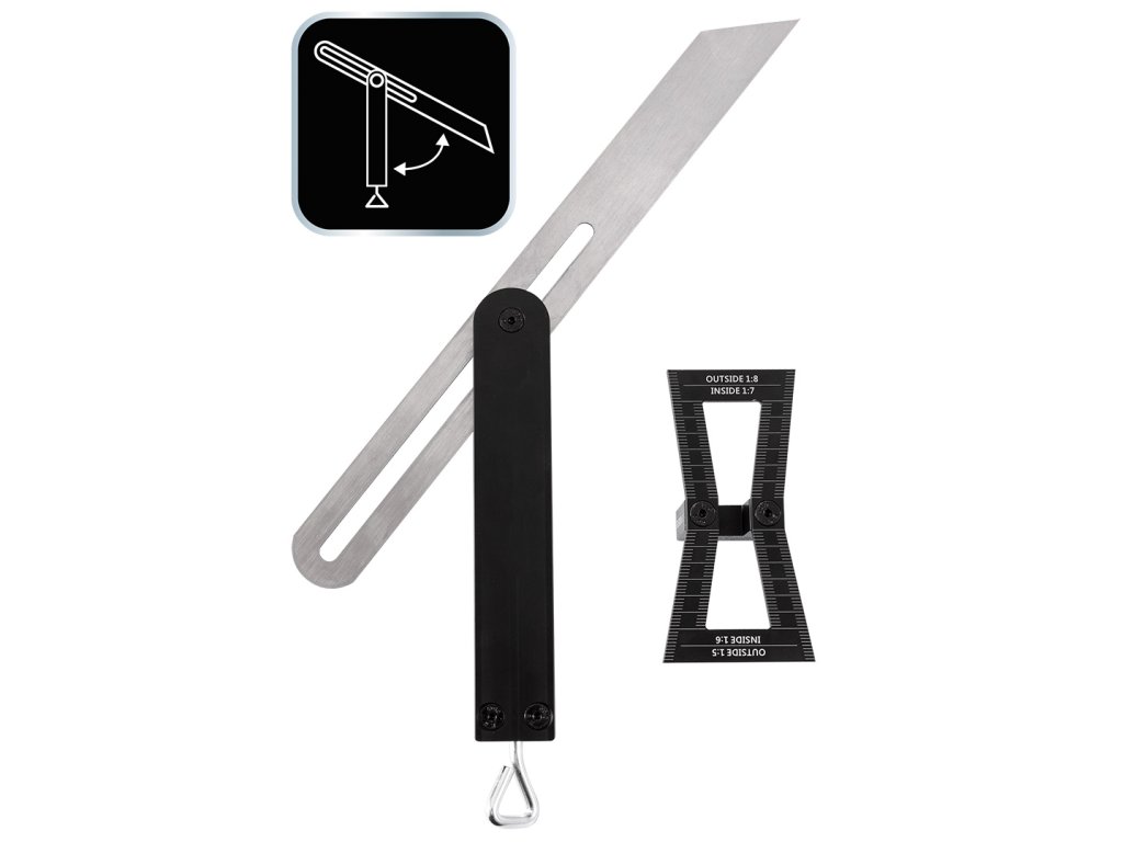 Nastaviteľný úkos, čepeľ z nehrdzavejúcej ocele, rukoväť a chvost z hliníka, zaistené oceľovou krídlovou maticou vloženou do oceľového závitu, možnosť nastavenia ľubovoľného uhla, dodatočne priložený chvost na kreslenie drevených spojov, stupnica: 1:5, 1:6, 1:7, 1:8