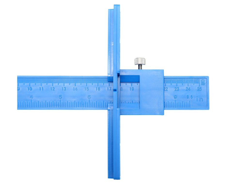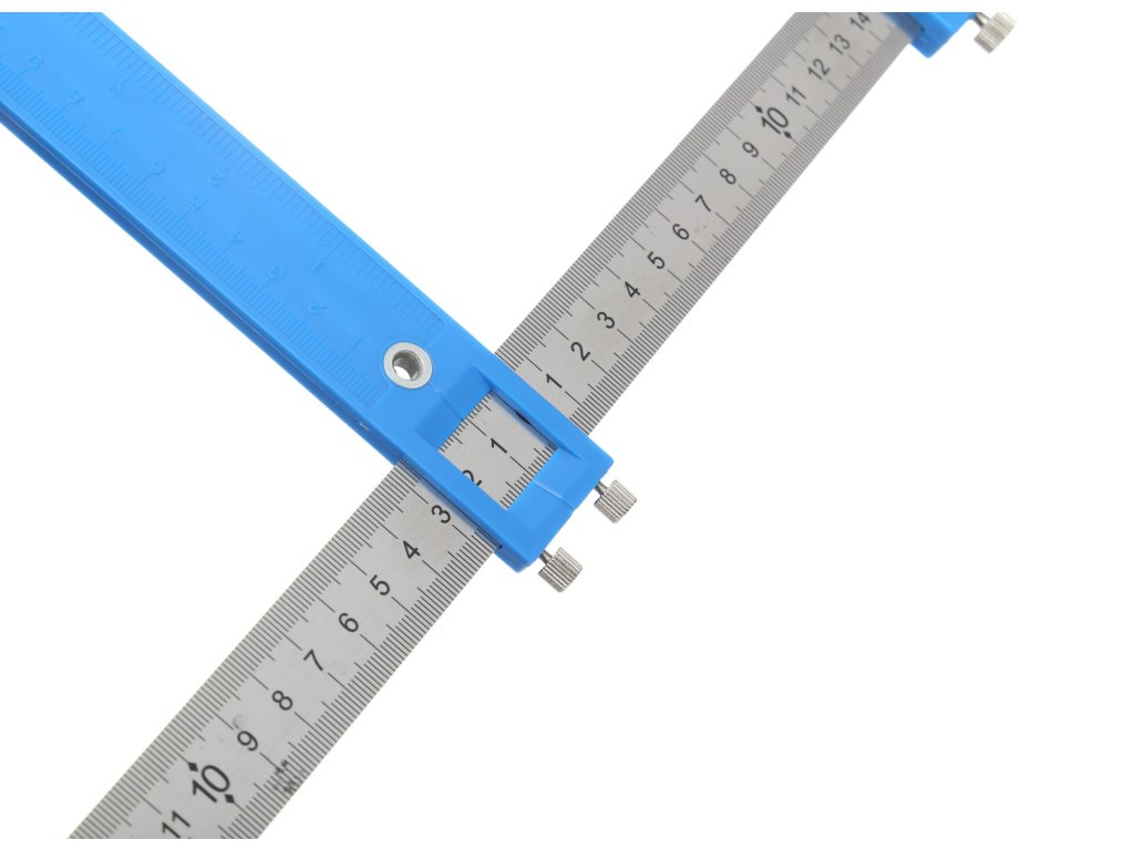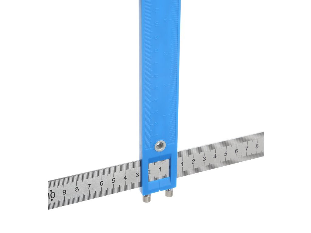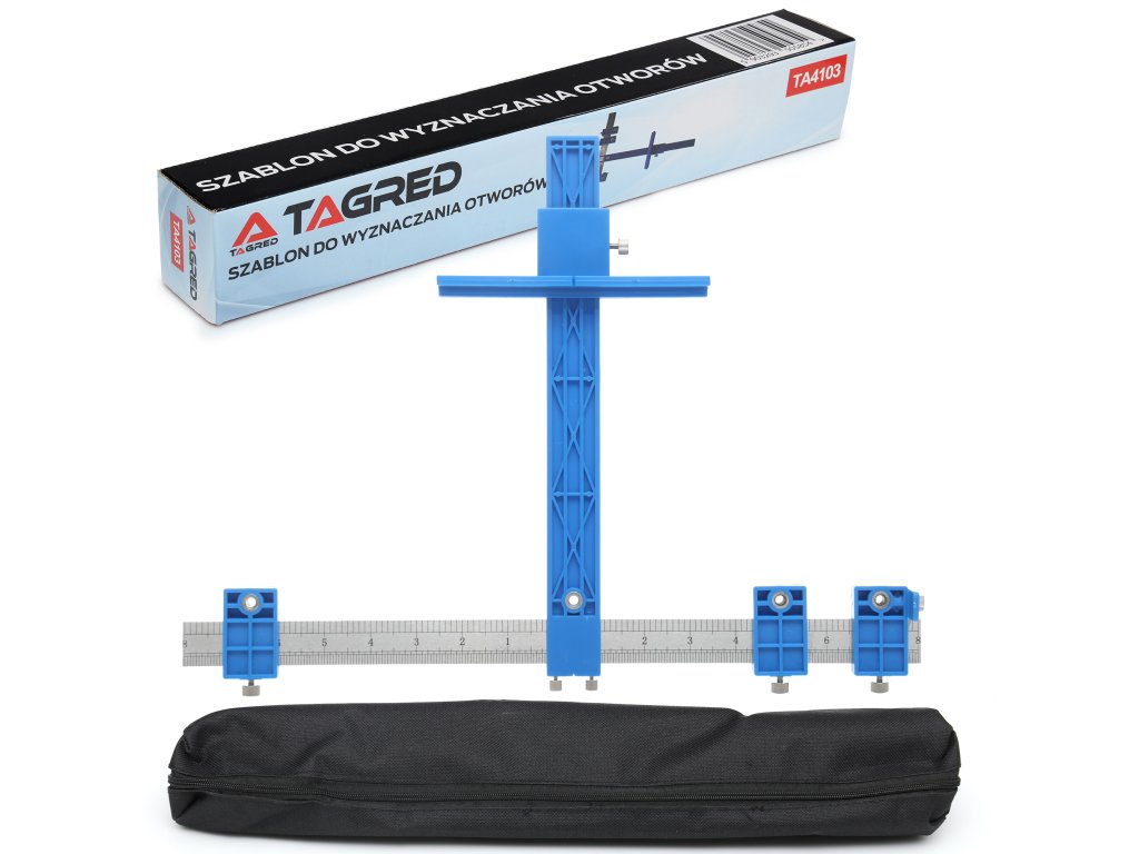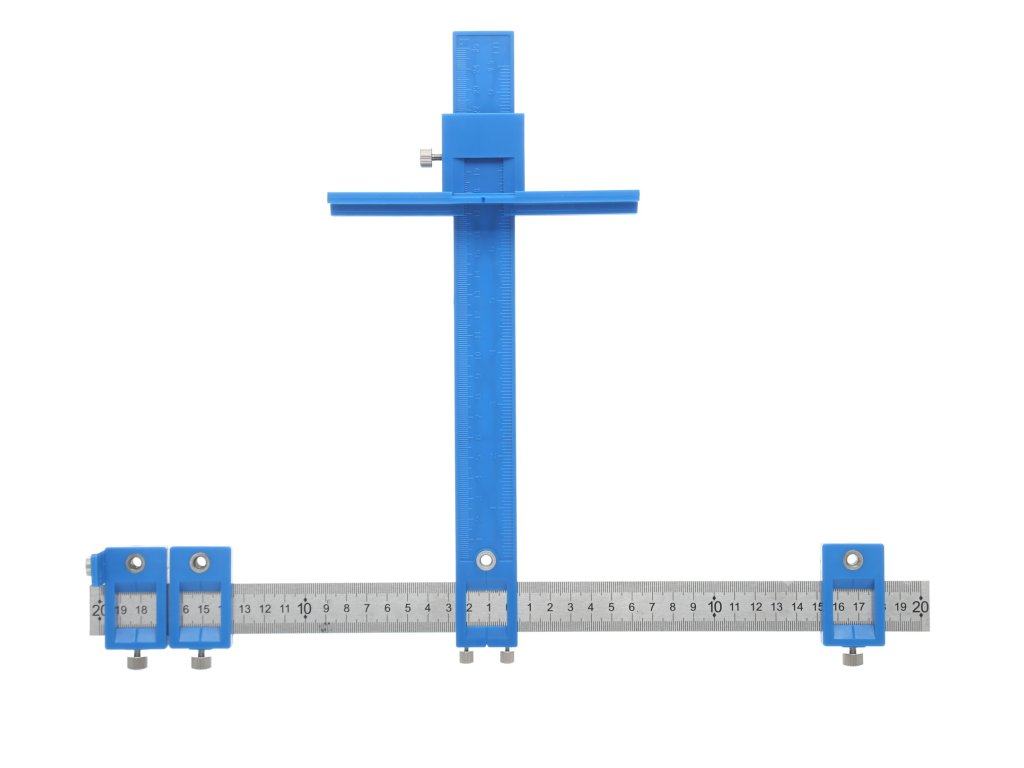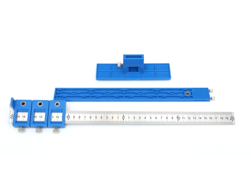 Šablóna, vodítko na určenie bodov vŕtania. Hlavná lišta s vyznačenou mierkou umožňuje nastavenie značky do hĺbky 25 cm od prednej strany nábytku. V hornej časti je namontovaná pohyblivá oceľová lišta, na ktorej sú umiestnené tri posuvné značky slúžiace na presné určenie bodov vŕtania. Po nastavení vzdialenosti je potrebné dotiahnuť upínací skrutku, čím sa nastavenie zafixuje.