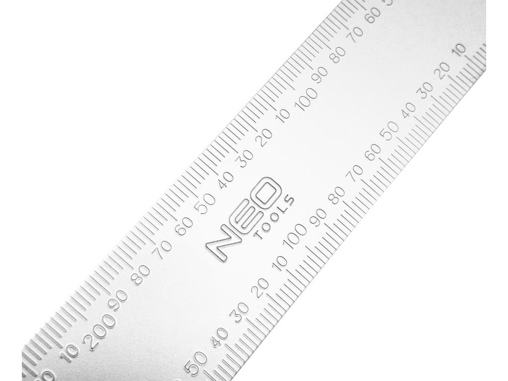 Strešný uhlový držiak 600 x 400 mm 72-130 od spoločnosti NEO je nástroj s rozmermi 600 x 400 mm na určovanie pravých uhlov. Na jeho povrchu je vyrytá stupnica s označením každé 2 mm. Je odolný voči oderu. Uhlová konzola má tiež tabuľku na určenie dĺžky krokiev a tabuľku s danými reznými uhlami v závislosti od hodnoty sklonu na meter vyčnievajúcej krokvy. Tento nástroj od značky NEO je určený na stavbu.