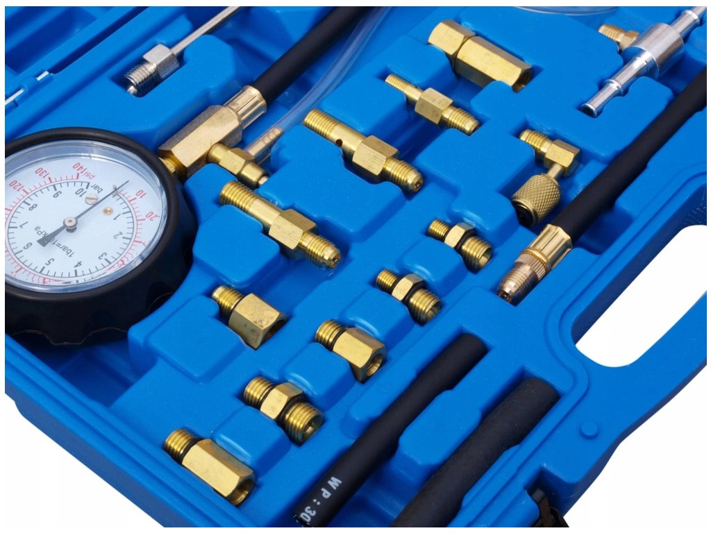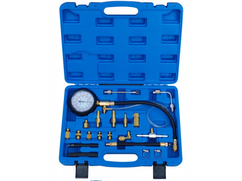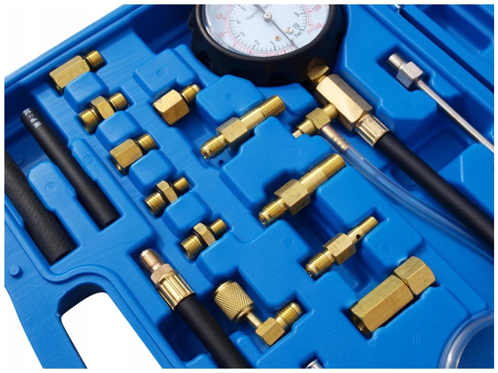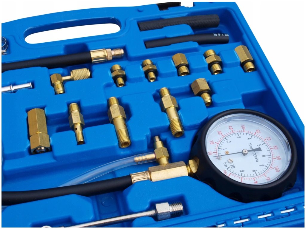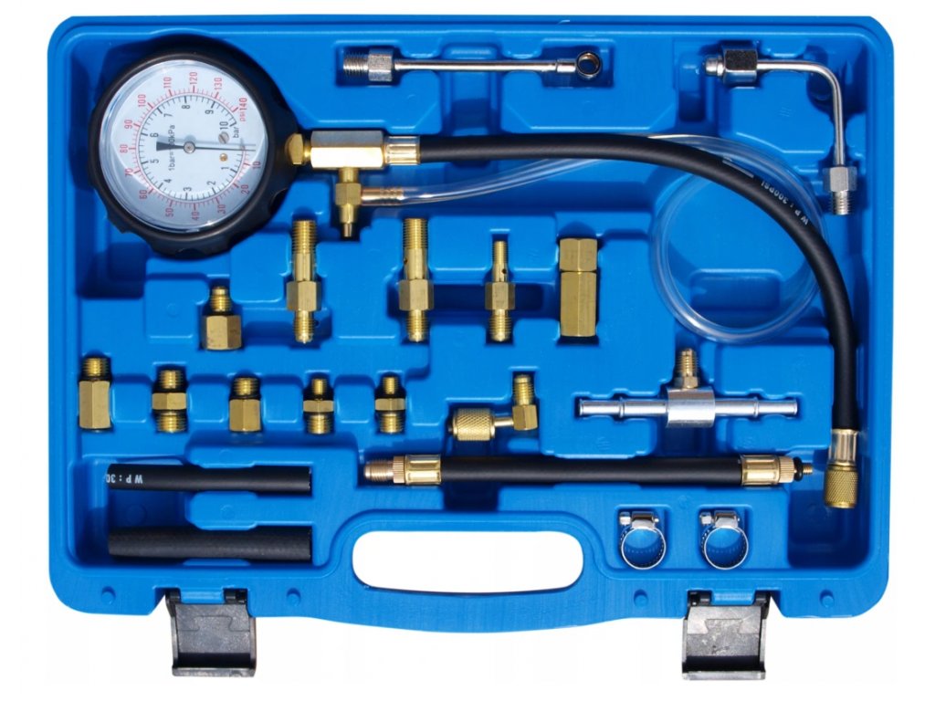 Tester na meranie tlaku paliva u väčšiny benzínových motorov. Meranie tlaku v rozsahu 0 - 10 barov alebo 0 - 140 psi. Tlakomer uchováva namerané hodnoty, ktoré sa až obnovia stlačením tlačidla na testovacom prístroji.