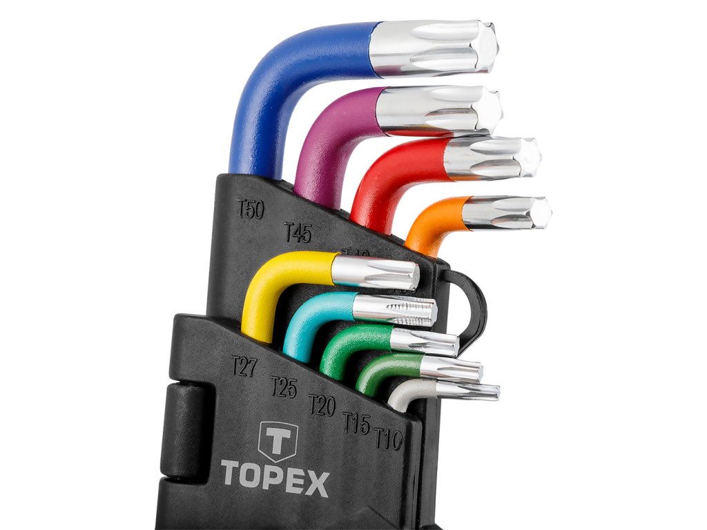 Sada kľúčov TOPEX Torx (ref. 35D969) obsahuje 9 kľúčov veľkosti T10 až T50 z odolnej chróm-vanádiovej ocele. Každá veľkosť kľúča je označená inou farbou, čo uľahčuje rýchly výber správnej veľkosti počas práce. Všetko je zabalené v praktickom balení. Značka TOPEX je zameraná na nadšencov pre domácich majstrov.