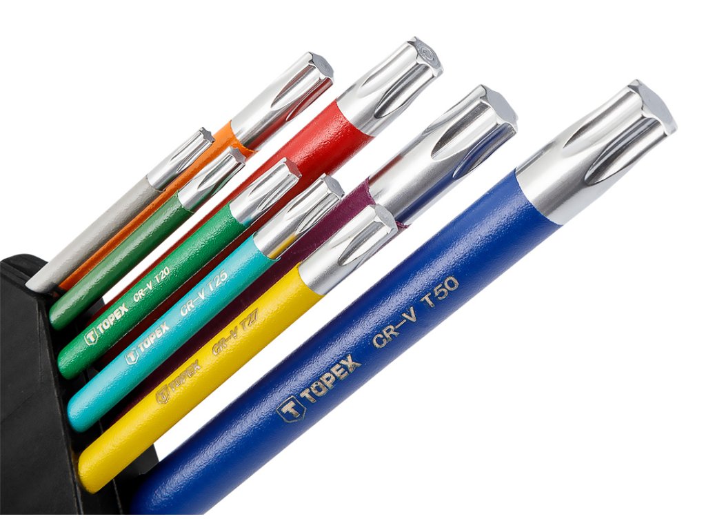 Kľúče Torx T10-T50, sada 9 kusov, CrV oceľ, veľkosti: T10, T15, T20, T25, T27, T30, T40, T45, T50, veľkosti farebne označené