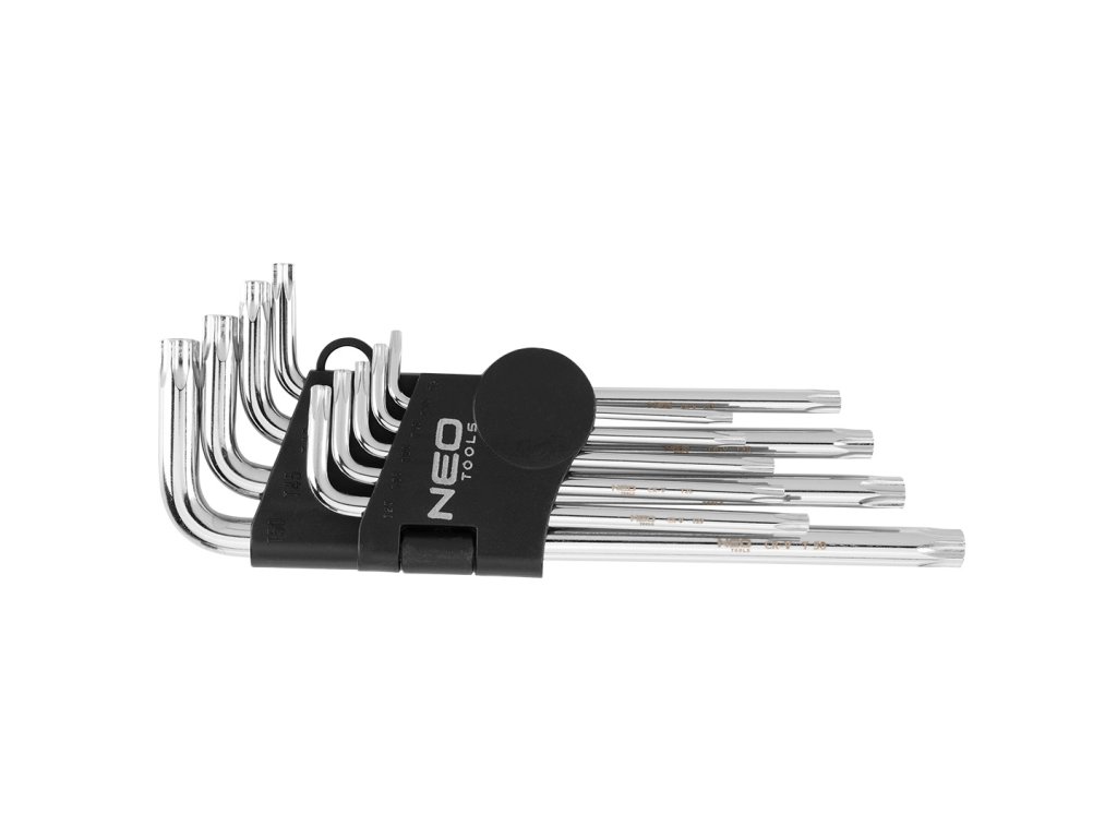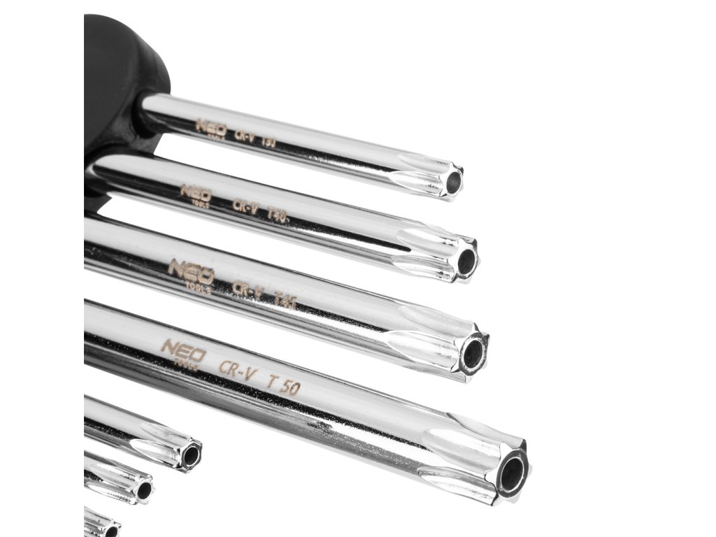 Sada kľúčov NEO Torx (ref. 09-526) obsahuje 9 kľúčov vo veľkostiach od T10 do T50, vyrobených z chróm-vanádiovej ocele. Magnetický hrot zvyšuje funkčnosť klávesov. Všetko je zabalené v praktickej škatuli. Spoľahlivosť výrobku potvrdzuje 25-ročná záruka. Značka NEO spĺňa očakávania profesionálov.