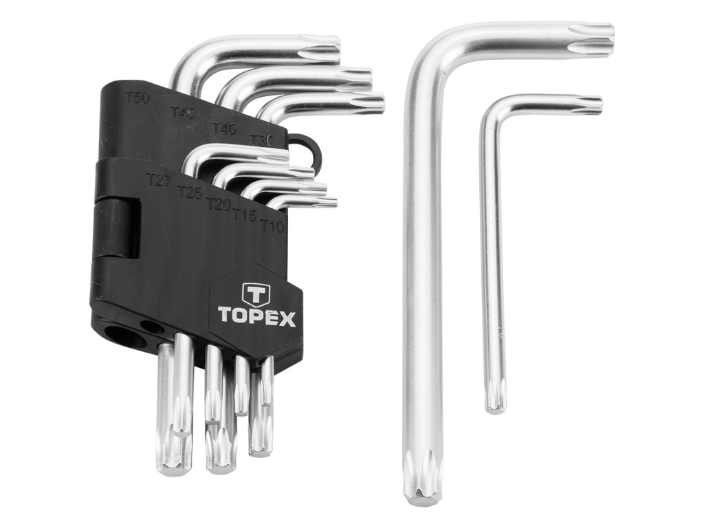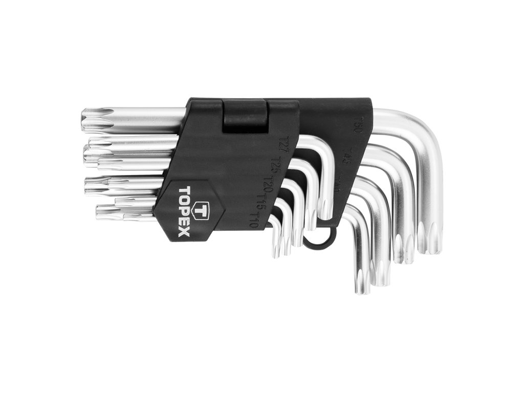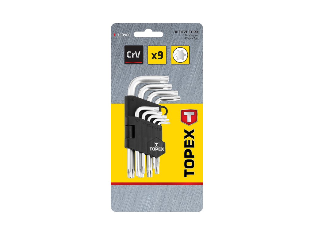 Krátke kľúče TOPEX Torx (ref. 35D960) sú vyrobené z odolnej chróm-vanádiovej ocele, ktorá zaručuje dlhú životnosť výrobku. Praktický plastový obal s označenou priehradkou pre každý kľúč uľahčuje ich skladovanie. Značka TOPEX je určená pre domácich majstrov.