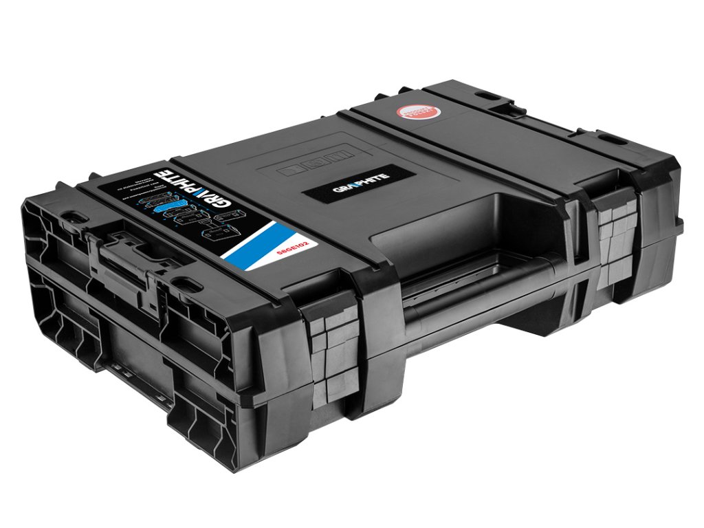 Kufrík na elektrické náradie GRAPHITE, rozmery 448(D) x 322(Š) x 126(V) mm, objem 11 litrov, tesnenie veka, odolný voči vode a prachu, polyamidové bočné spojky, zosilnená konštrukcia tela, pevné spojovacie prvky, pružné upevňovacie pásy, ochranná pena