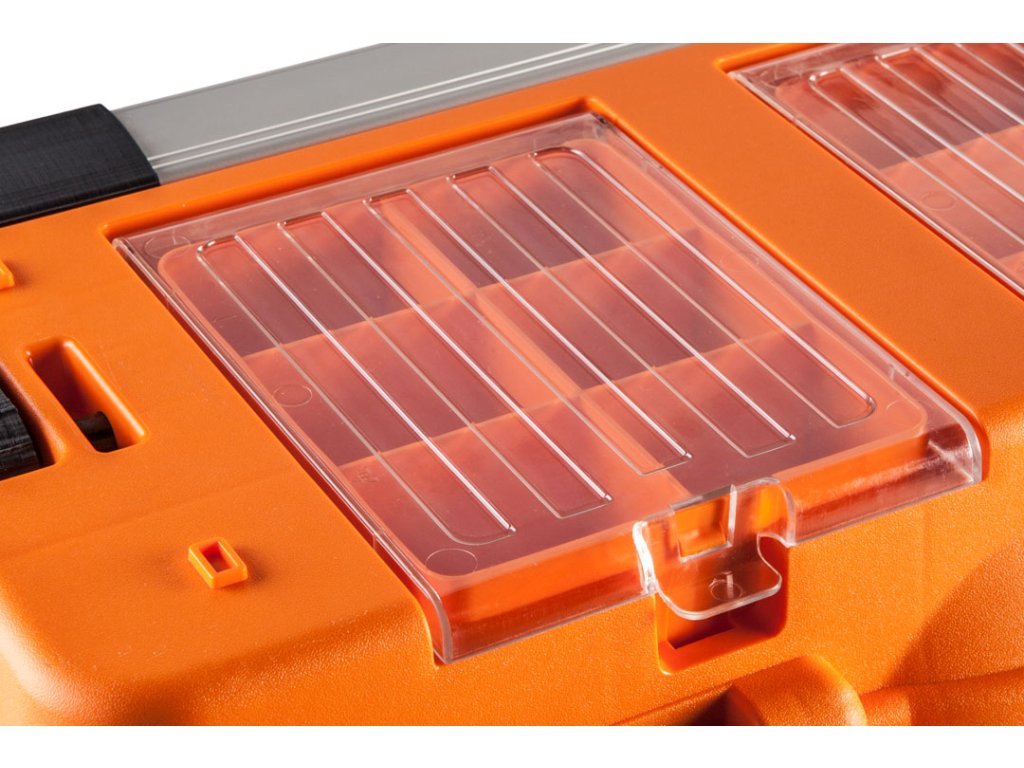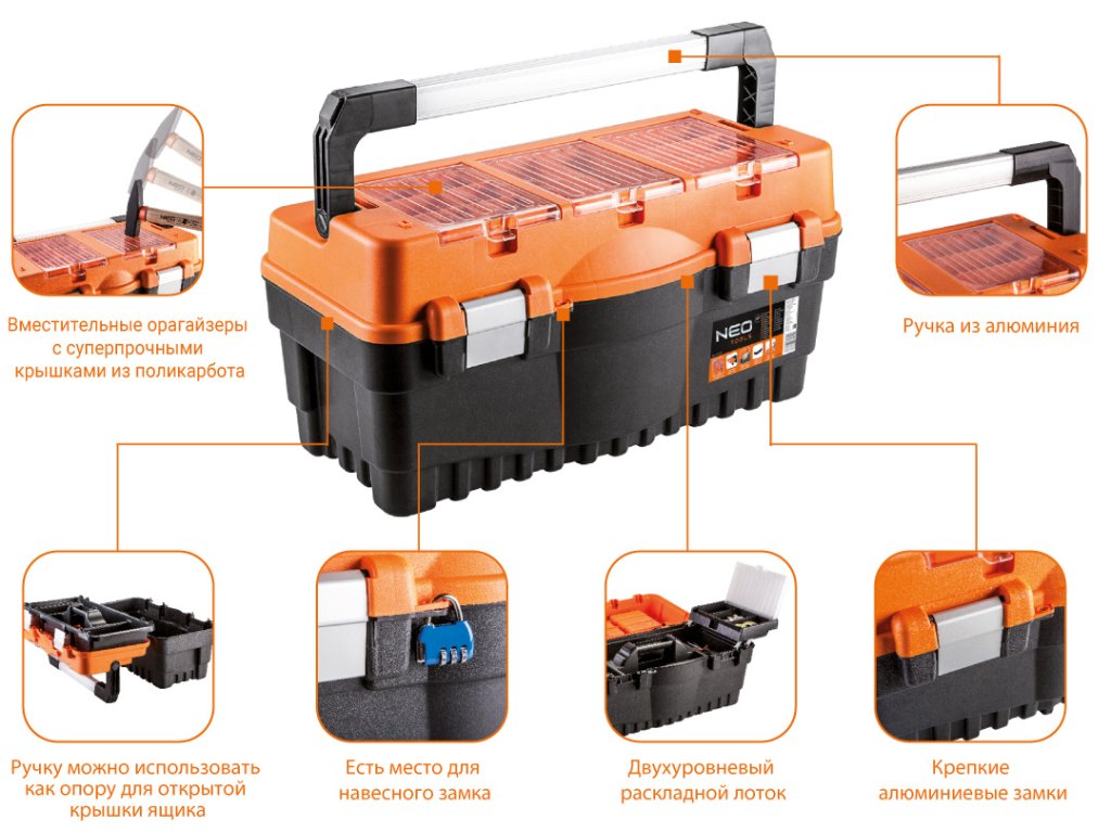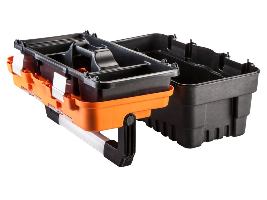 Debnička na náradie 18" NEO (ref. č. 84-102) s rozmermi 46,2 x 25,6 x 24,2 cm, hliníkovú rukoväť, hliníkové západky, 2 organizéry, polykarbonátové kryty organizérov, rozkladací podnos, miesto na zámku