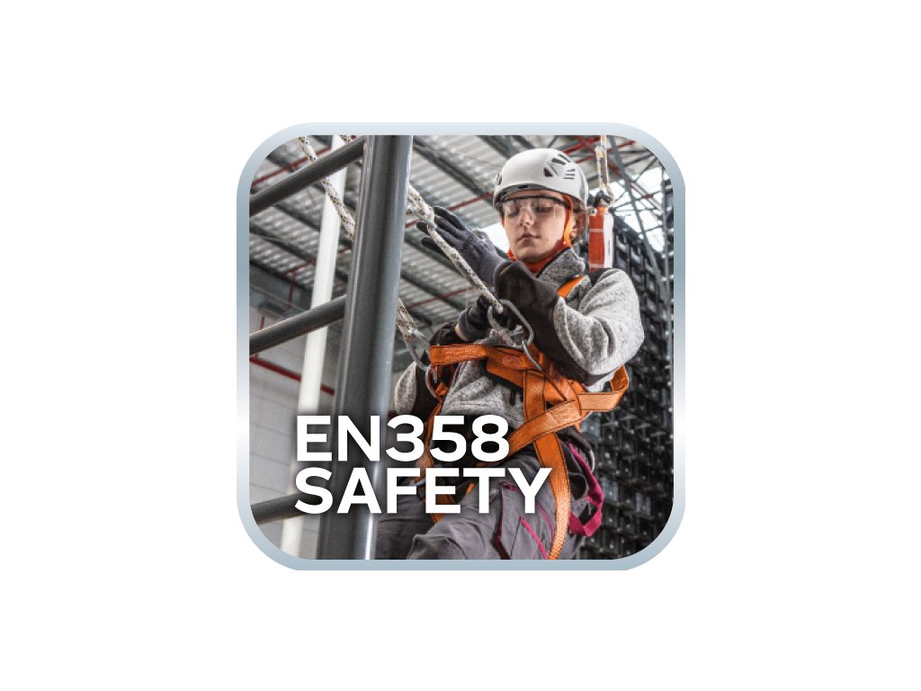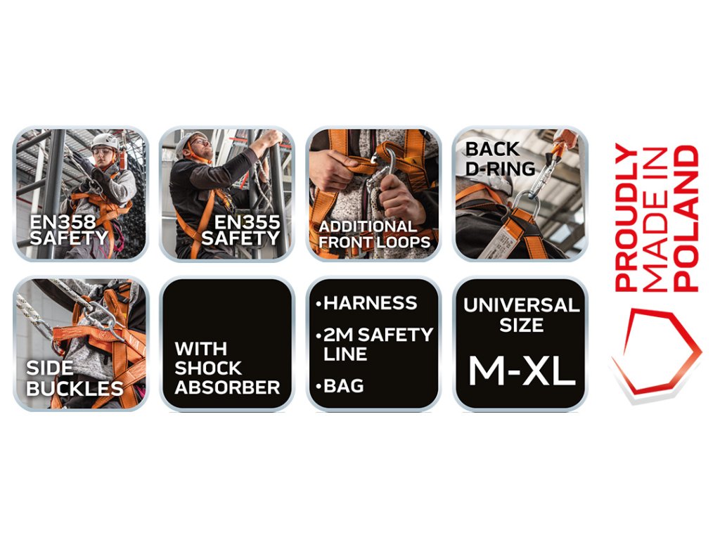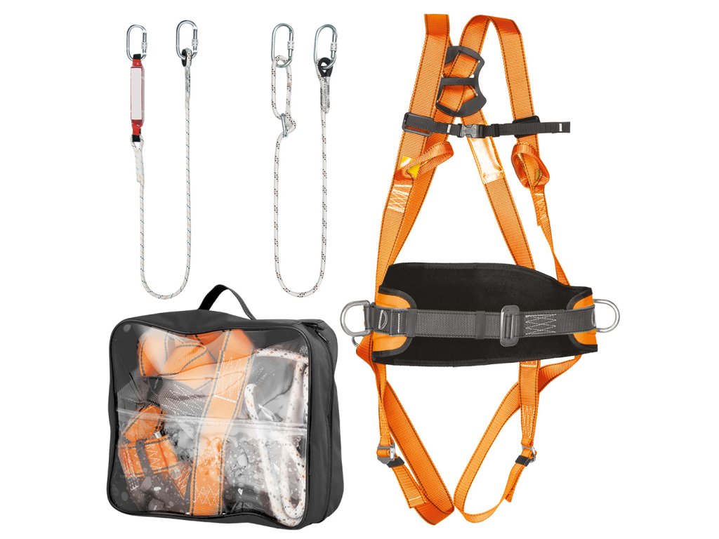 Súprava na istenie s opaskom a tlmičom nárazov, súprava obsahuje: postroj, hmotnosť 1120 g, veľkosť M-XL, polyesterový popruh 45 mm, spony a pracky z pozinkovanej ocele; bezpečnostný tlmič nárazov s 2 m dlhým lanom; 2 m dlhé nastaviteľné bezpečnostné lano; štyri karabíny s poistnou maticou typu "Screw-Lock"; polyesterovú tašku na prenášanie, CE certifikát o zhode s normami EN 355:2002 a EN358:2002.