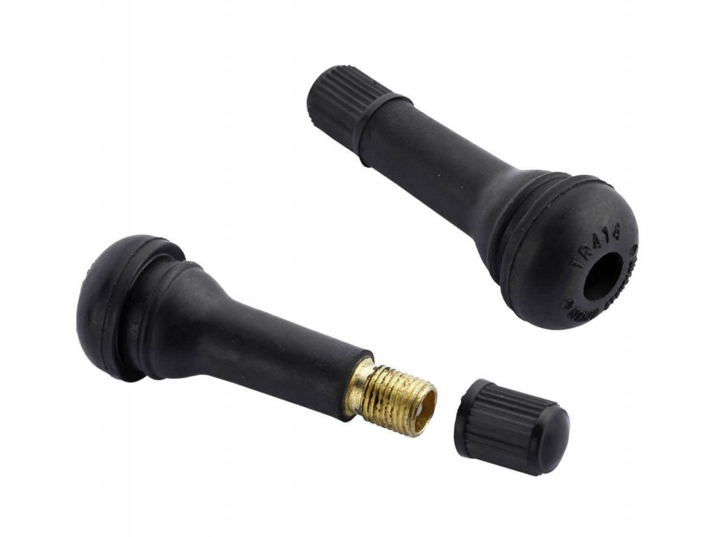 Sada gumových ventilov TR 414 s pružinovou vložkou a uzáverom. Využitie nájde u väčšiny oceľových a hliníkových ráfikov.