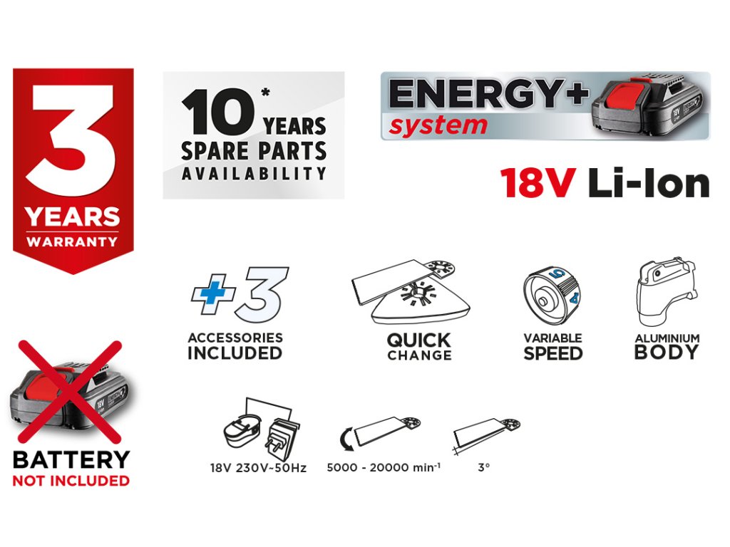 Akumulátorové multifunkčné zariadenie 18V, Li-Ion, počet kmitov 5000 - 20000 min??, oscilačný uhol 3°, pätka 80 x 80 x 80 mm, (LxH) 300 x 140 mm, hmotnosť 1,8 kg, príslušenstvo: pracovné nástavce - 2 ks, brúsny papier - 1 ks, kompatibilné s akumulátormi Energy+