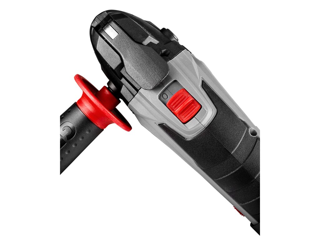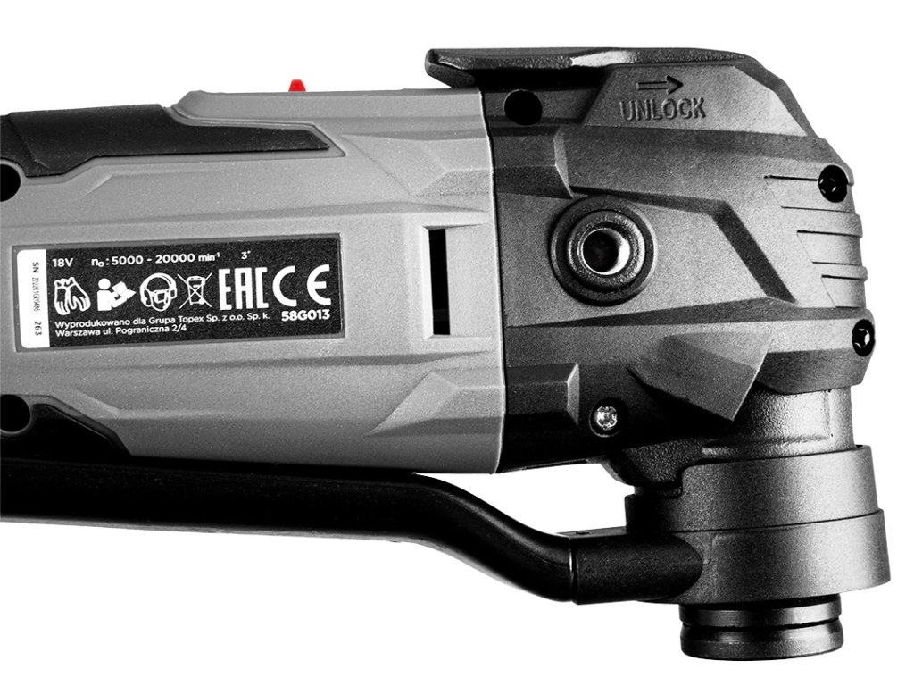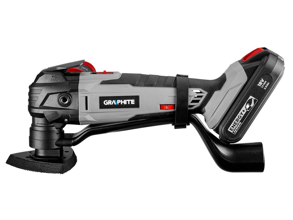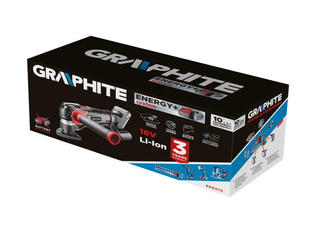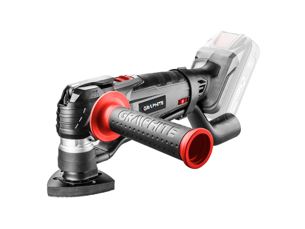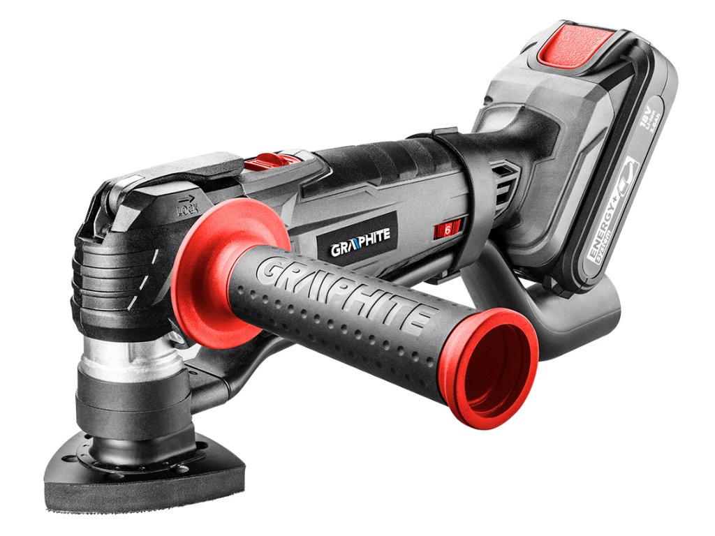 Multifunkčné zariadenie GRAPHITE, spolupracujúce s akumulátormi 18 V Li-Ion GRAPHITE Energy+. Je to všestranné zariadenie určené na rezanie, brúsenie alebo škrabanie materiálov ako: kov, drevo alebo keramika. Hlavica zariadenia vykonáva 5000 až 20000 kmitov za minútu, oscilačný uhol - 3°. Zariadenie je vybavené systémom rýchlej výmeny príslušenstva bez použitia náradia. Vďaka univerzálnemu skľučovadlu nástrojov má používateľ možnosť použiť rôzne pracovné nástavce značky GRAPHITE, ako aj rôzne typy príslušenstiev iných značiek. Obloženie prevodovky zariadenia je vyrobené z odolnej zliatiny hliníka. V súprave zariadenia sa nachádza adaptér na odsávanie prachu, ktorý umožňuje pripojenie odsávača počas brúsenia. Špeciálne vyprofilovaná, pogumovaná rukoväť zaručuje pevné uchopenie a komfort požívania. Pre istejšie vedenie zariadenia existuje možnosť dvojpolohovej montáže prídavnej rukoväte. Pracovisko osvetľujú dve jasné LED diódy.