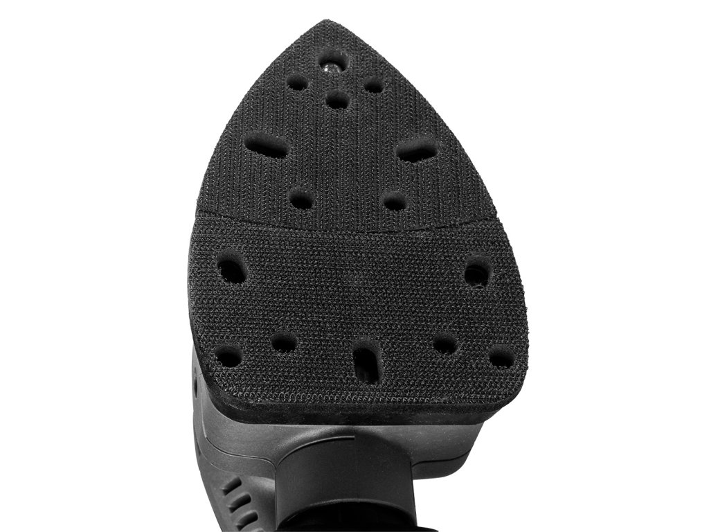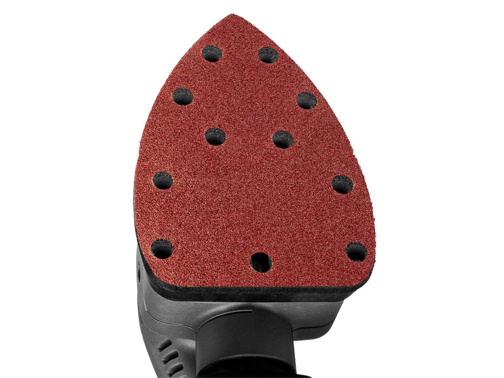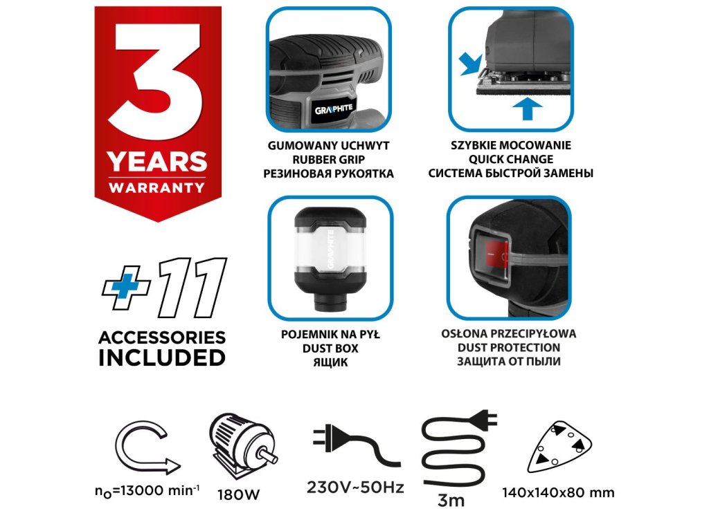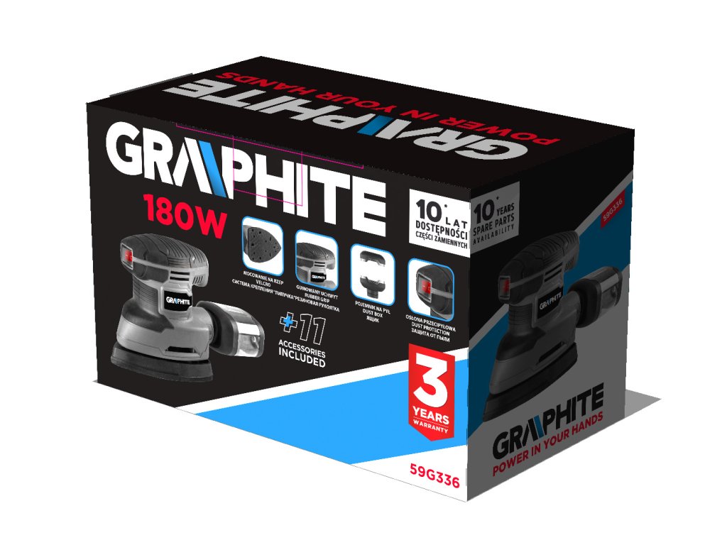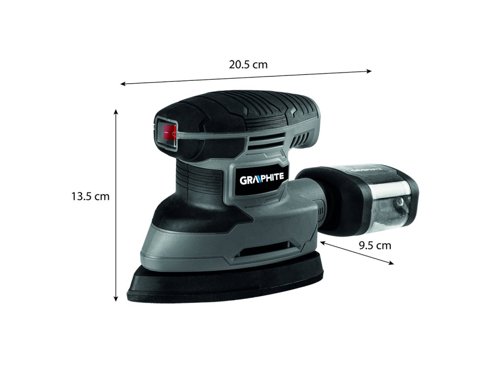 180 W delta orbitálna brúska, 140 x 140 x 80 mm pätka 59G336 od GRAPHITE je 180 W náradie s trojuholníkovou pätkou 140 x 140 x 80 mm a kompatibilným brúsnym papierom 140 x 140 x 97 mm. Dosahuje rýchlosť 13 000 min-? a amplitúdu kmitania 0,8 mm. Brúska sa dodáva s 3 nožičkami, brúsnymi papiermi (9 kusov) a špicom. Hmotnosť stroja je 1 kg. Tento model brúsky sa vyznačuje protišmykovou rukoväťou, ktorá sa pohodlne používa, a systémom odsávania prachu. Má praktický 3 m dlhý napájací kábel s pogumovaným povrchom. Je to nepostrádateľný nástroj na brúsenie, leštenie a účinné odstraňovanie hrdze alebo farby.