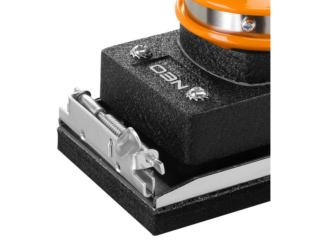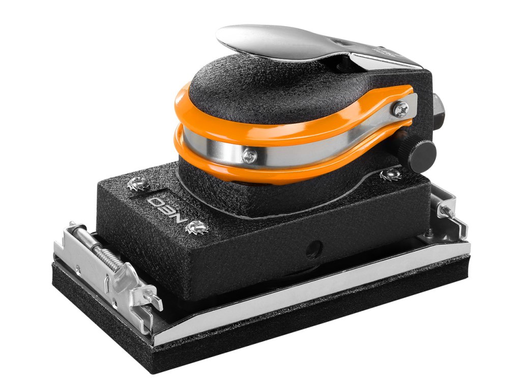 Obdĺžniková pneumatická orbitálna brúska 14-018 NEO umožňuje efektívne a účinné brúsenie veľkých plôch. Vďaka prívodu stlačeného vzduchu sa osvedčí pri dlhodobej práci. Je vybavená pohodlnou rukoväťou, ktorá zvyšuje pohodlie pri práci znížením vibrácií, a kovovými svorkami, ktoré umožňujú používať brúsny papier vystrihnutý z rolky. Náradie má aj univerzálnu vzduchovú prípojku ?". Výstup vzduchu sa nachádza na zadnej strane brúsky. Vlastnosti: veľkosť pätky 89 x 165 mm; maximálne otáčky 9 0000 ot/min; priemerná spotreba vzduchu 128 l/min; prevádzkový tlak 6,3 bar; výstup vzduchu vzadu; pripojenie vzduchu 1/4"; dĺžka brúsky: 165 mm.