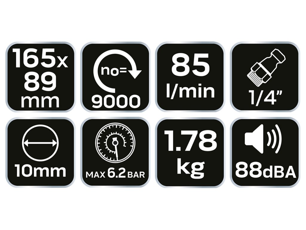 Pneumatická orbitálna brúska obdĺžniková, rozmery pätky 89x165 mm, 9 000 otáčok za minútu, pracovný tlak 6,3 - 7 barov, priemerná spotreba 128 l/min, hmotnosť 1,78 kg, CE