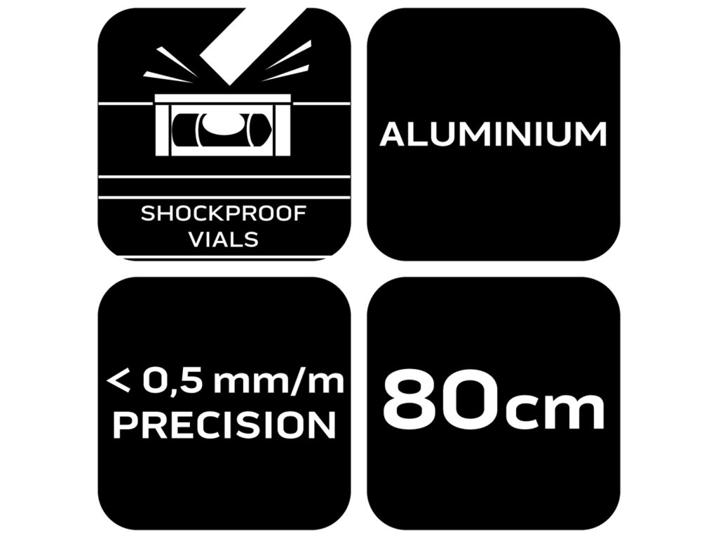 Hliníková vodováha 80 cm, 3 ľahko čitateľné libelly, 2 držadlá, 2 uzávery proti pretáčaniu, hrúbka profilu 1,2 mm, presnosť 0,029°=0,5 mm/m