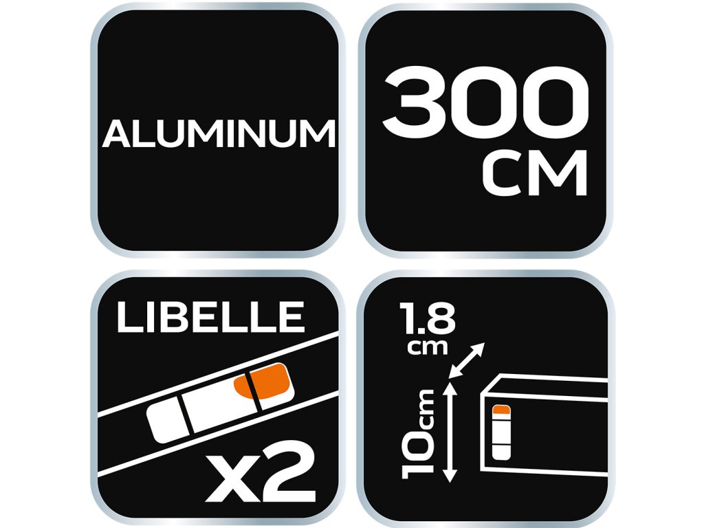 murárska palica NEO (ref. 72-525) s dĺžkou 300 cm a obdĺžnikovým prierezom. Využitie nachádza počas stavebných prác. Vyrobené z vysokokvalitného hliníka. Vďaka dvom zabudovaným libelám, horizontálnej a vertikálnej, je možné aj vyrovnávanie. Značka NEO spĺňa očakávania profesionálov.