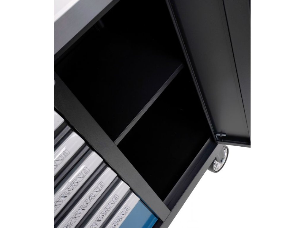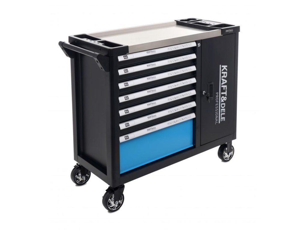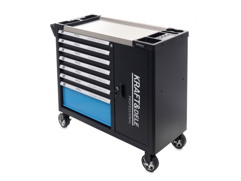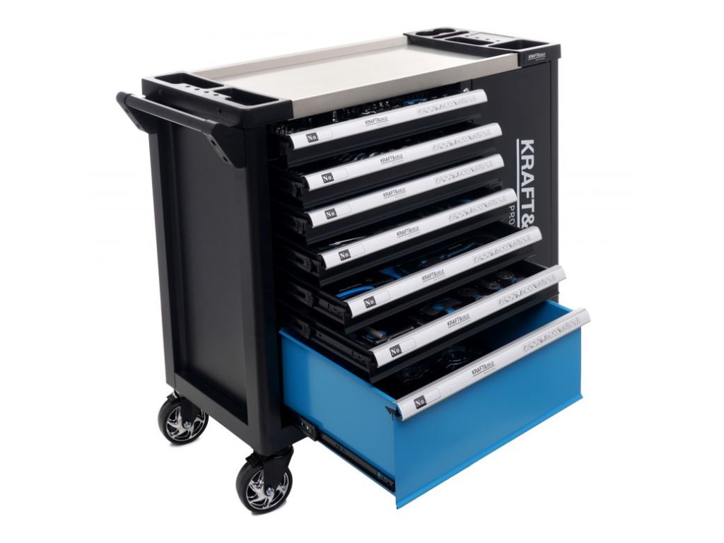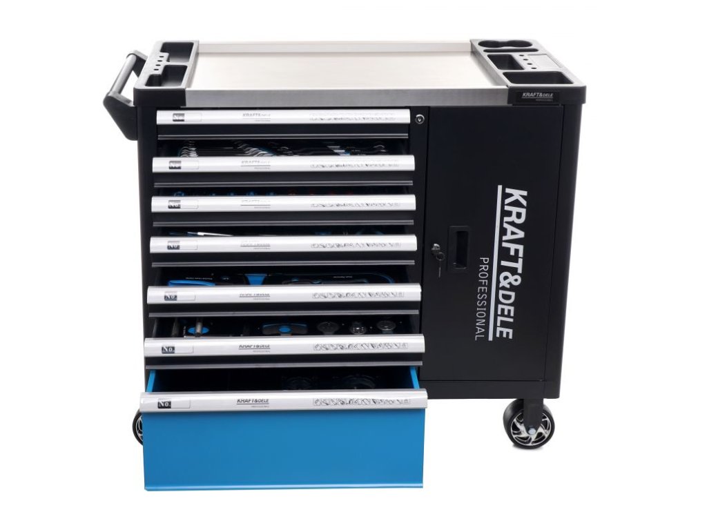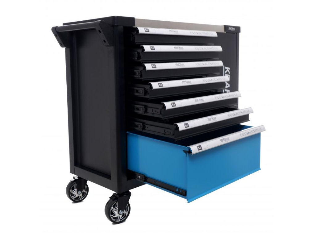 Vozík určený do dielne pozostáva zo 7 zásuviek, pričom sú vybavené profesionálnym dielenským náradím špecifickým pre autoservisy, ktoré určite pri svojej práci využijete. Posledná najväčšia zásuvka je navrhnutá pre uloženie väčšieho náradia ako sú vŕtačky, brúsky či rôzne pneumatické náradie. Náradie v zásuvkách je uložené v tvrdej pene s označením pre dokonalý poriadok a jednoduchú orientáciu. Zásuvky s guľôčkovými ložiskami sa budú jednoducho a ľahko zasúvať aj vysúvať. Zásuvky sú chránené proti náhodnému otvoreniu nenápadnou kľukou pod madlom. Skrinka je vybavená zámkom, ktorý po zamknutí automatický uzatvorí všetky zásuvky. Vozík je na boku vybavený dvojposchodovým priestranným úložným priestorom so zámkom na kľúč.