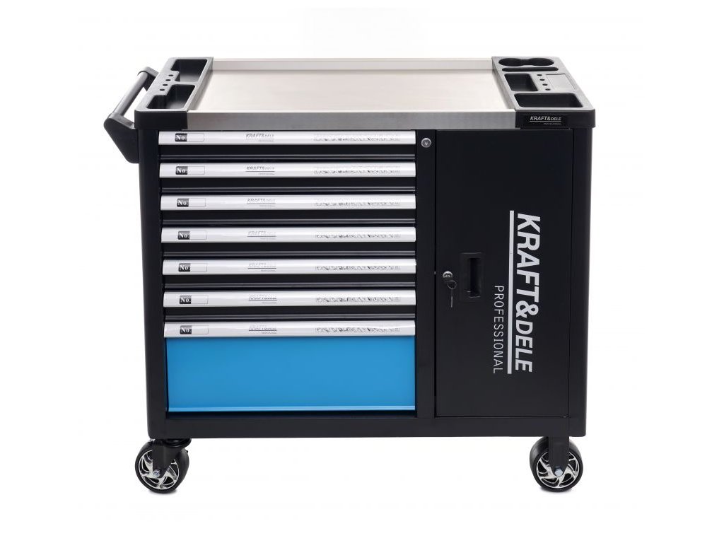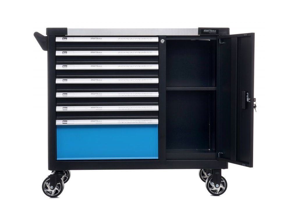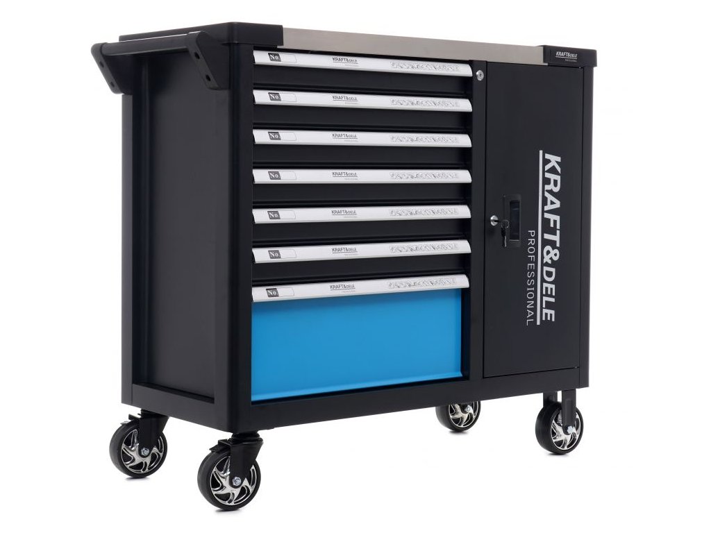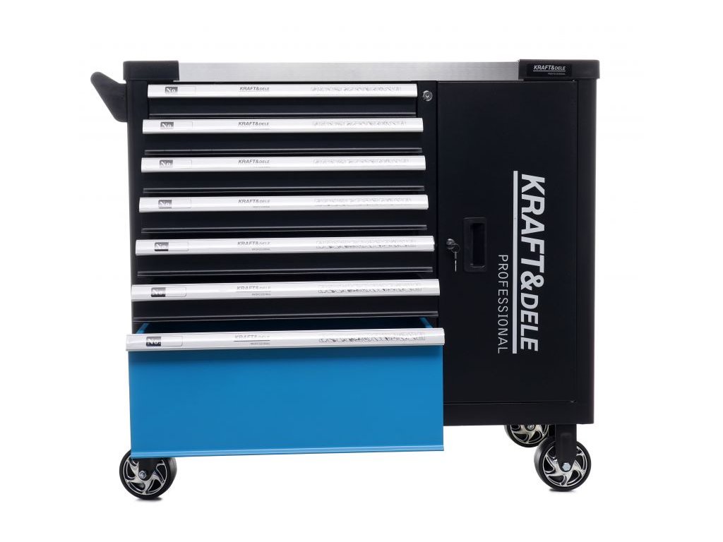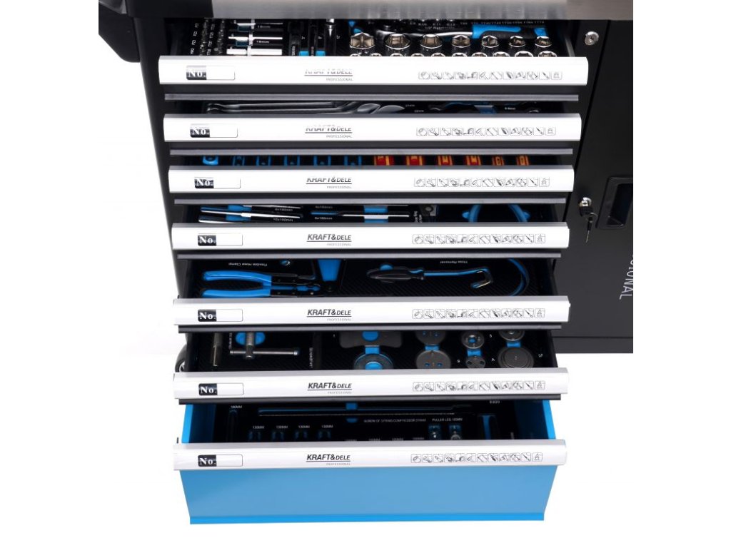 Vozík určený do dielne pozostáva zo 7 zásuviek, pričom sú vybavené profesionálnym dielenským náradím špecifickým pre autoservisy, ktoré určite pri svojej práci využijete. Posledná najväčšia zásuvka je navrhnutá pre uloženie väčšieho náradia ako sú vŕtačky, brúsky či rôzne pneumatické náradie. Náradie v zásuvkách je uložené v tvrdej pene s označením pre dokonalý poriadok a jednoduchú orientáciu. Zásuvky s guľôčkovými ložiskami sa budú jednoducho a ľahko zasúvať aj vysúvať. Zásuvky sú chránené proti náhodnému otvoreniu nenápadnou kľukou pod madlom. Skrinka je vybavená zámkom, ktorý po zamknutí automatický uzatvorí všetky zásuvky. Vozík je na boku vybavený dvojposchodovým priestranným úložným priestorom so zámkom na kľúč.