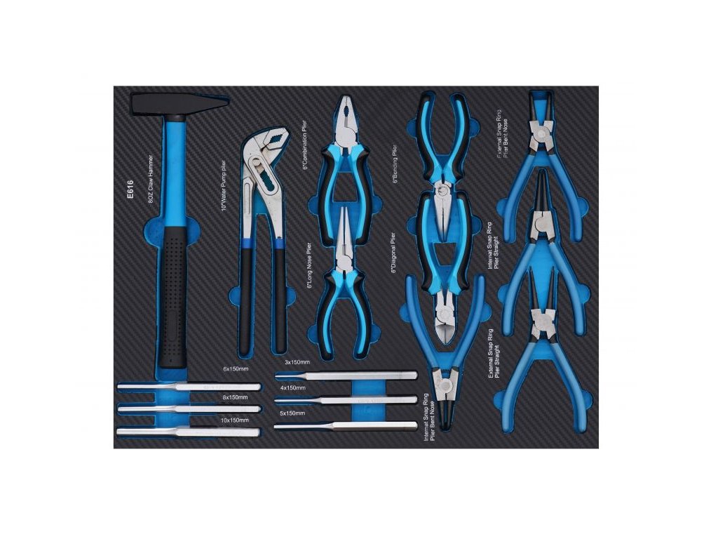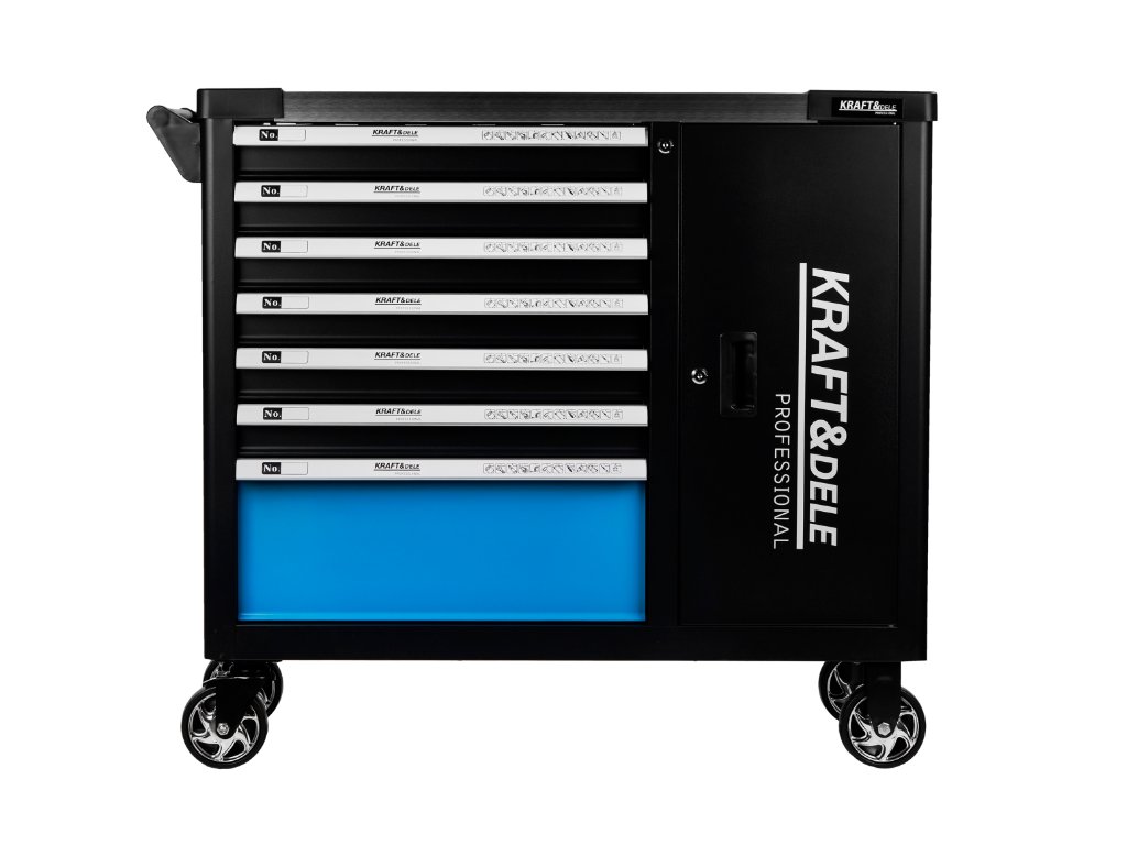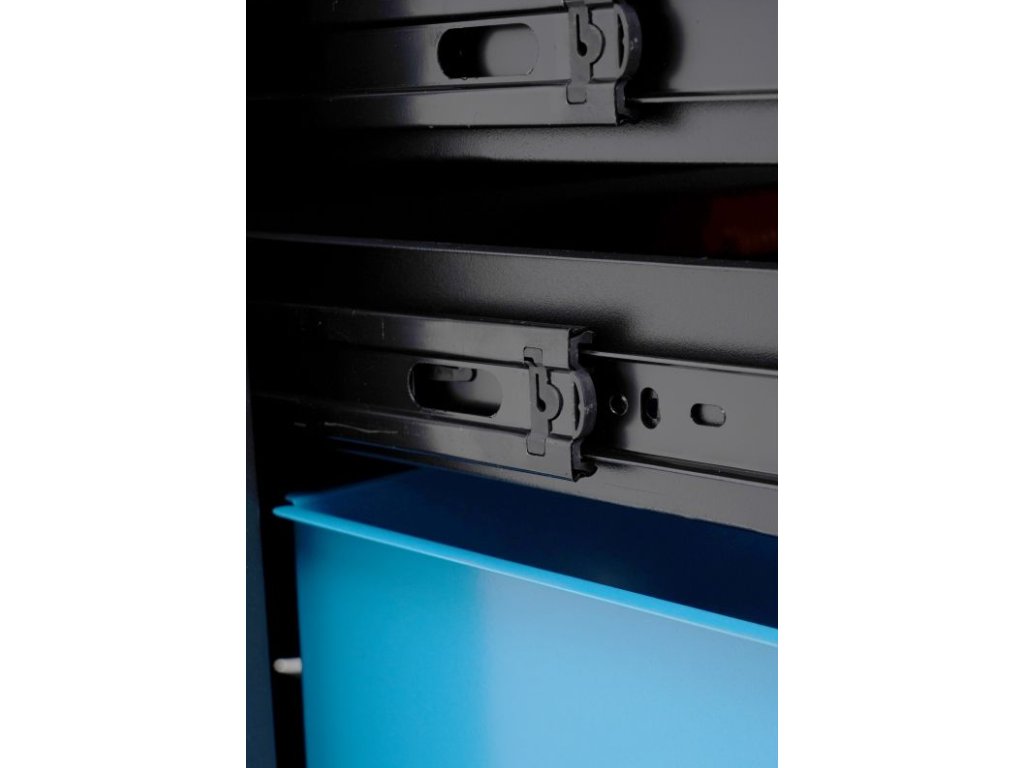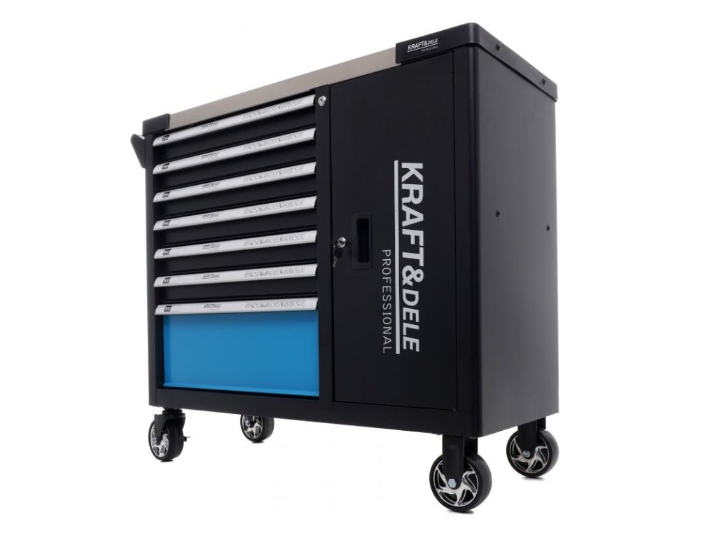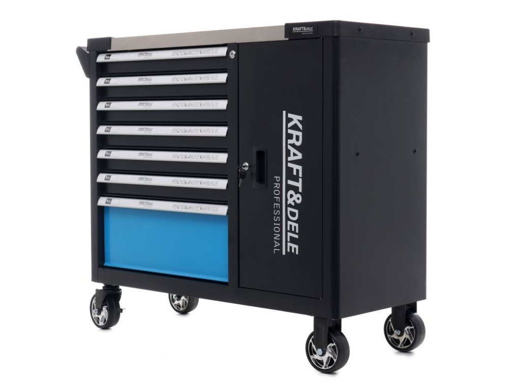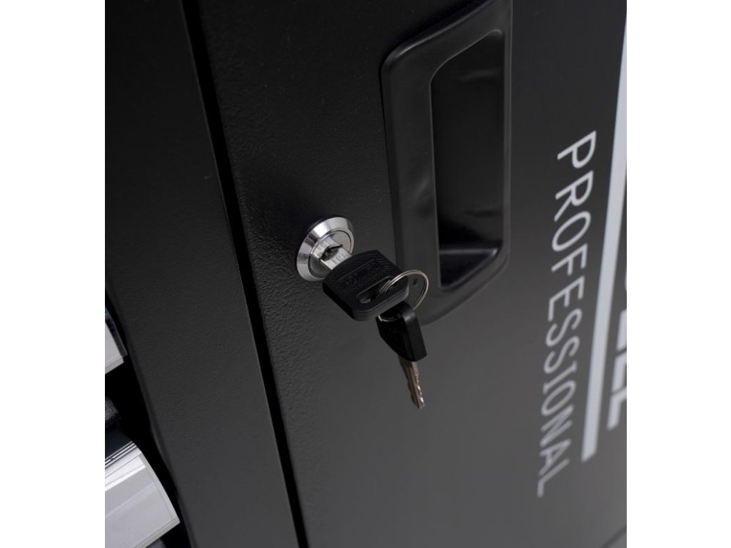 Vozík určený do dielne pozostáva zo 7 zásuviek, pričom sú vybavené profesionálnym dielenským náradím špecifickým pre autoservisy, ktoré určite pri svojej práci využijete. Posledná najväčšia zásuvka je navrhnutá pre uloženie väčšieho náradia ako sú vŕtačky, brúsky či rôzne pneumatické náradie. Náradie v zásuvkách je uložené v tvrdej pene s označením pre dokonalý poriadok a jednoduchú orientáciu. Zásuvky s guľôčkovými ložiskami sa budú jednoducho a ľahko zasúvať aj vysúvať. Zásuvky sú chránené proti náhodnému otvoreniu nenápadnou kľukou pod madlom. Skrinka je vybavená zámkom, ktorý po zamknutí automatický uzatvorí všetky zásuvky. Vozík je na boku vybavený dvojposchodovým priestranným úložným priestorom so zámkom na kľúč.