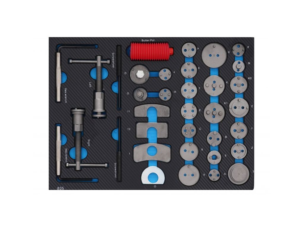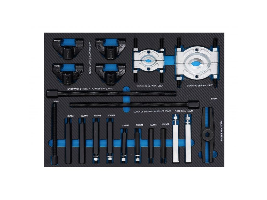 - Zahŕňa okrem iného aj sťahovaky pružín, ktoré sú nevyhnutné pri profesionálnom servise podvozkov. Prispôsobené všetkým typom pružín typu McPherson a nezávislých pružinách. V zásuvke sú aj sťahováky ložísk.