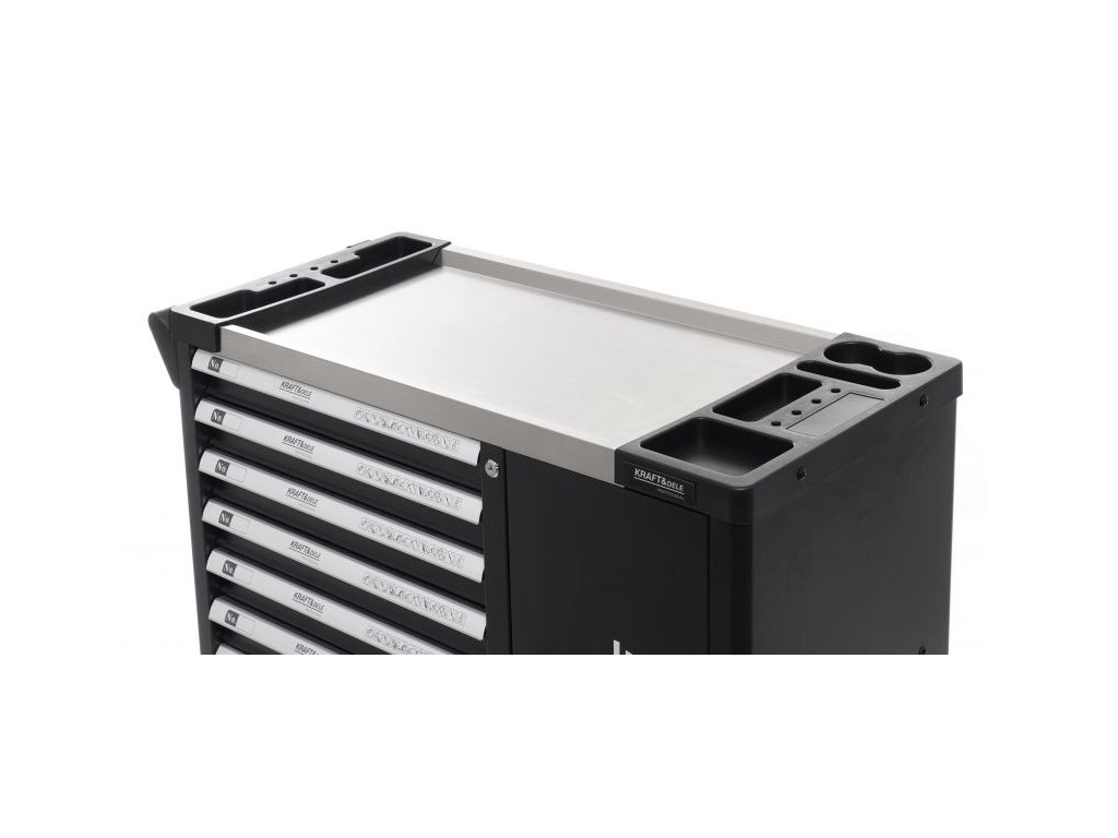 Skrinka je vďaka mohutnej a kvalitnej konštrukcii, ktorá je vyrobená z dvojitého plechu, odolná a veľmi pevná. O pohodlné a najmä ľahké presúvanie vozíka po dielni sa postará ergonomická rukoväť integrovaná s doskou stola a 4 dostatočne veľké kolesá, pričom 2 z nich majú aj brzdu. Vrchná časť s kovovou pracovnou doskou poskytuje dostatočný priestor pre vašu prácu, po bokoch je vybavená priehradkami, čo zefektívni vašu prácu a poskytne ďalší priestor na uloženie náradia, dielov, skrutiek či iných prvkov.