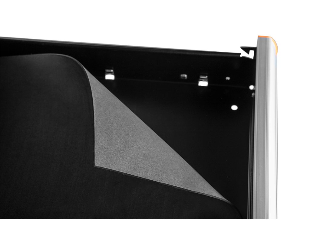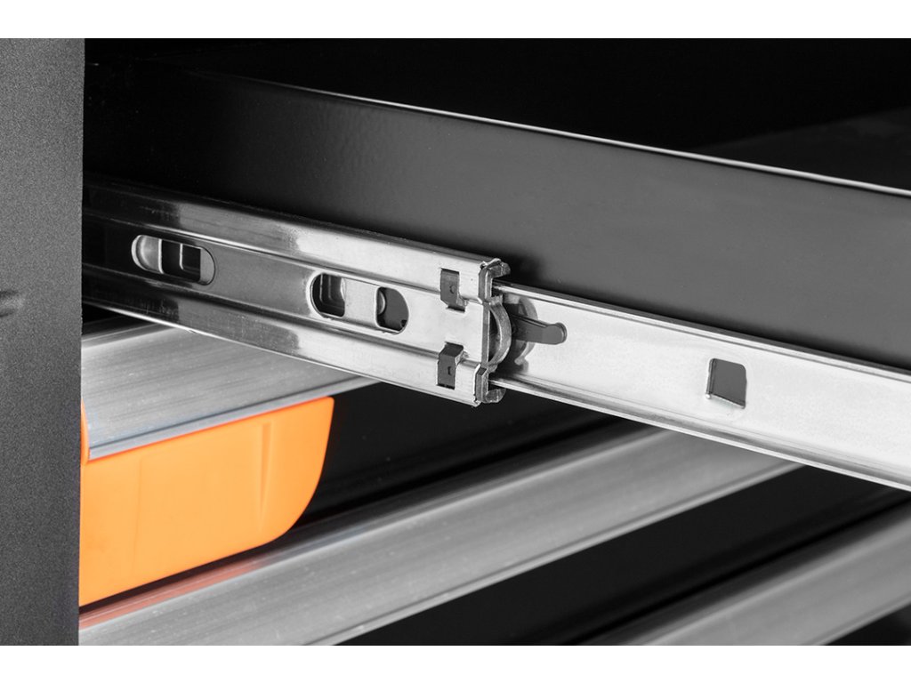 Skriňa na náradie 7 zásuviek, rozmery 775 x 465 x 978 mm, výška bez koliesok 820 mm, oceľová skrinka, nosnosť 300 kg, hliníková horná časť s priestormi na skrutkovače a príslušenstvo, bočná perforácia na háčiky Neo, rukoväť, informačné nálepky na čelách zásuviek, doraz zásuvky, 100 % otváranie zásuviek, kompatibilné s vložkami na náradie Neo, guľôčkové výsuvy, centrálne zamykanie, dva kľúče, zámok kolies, rohové zarážky, 2 mm EVA rohož v zásuvkách, 5-palcové PU kolieska.