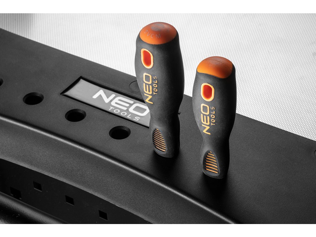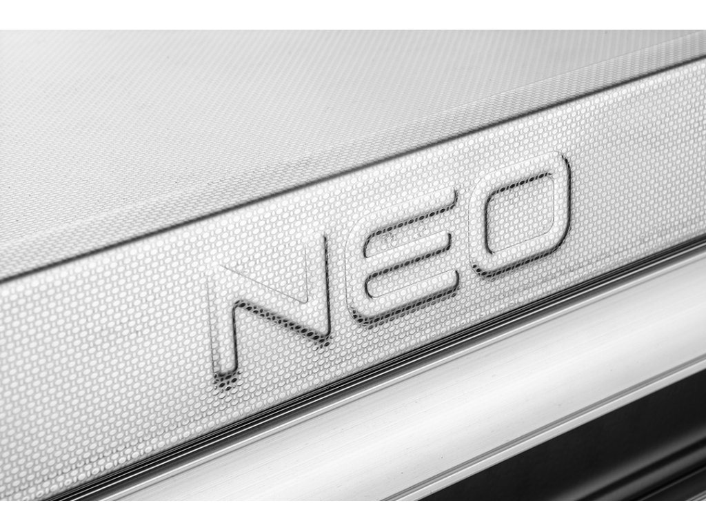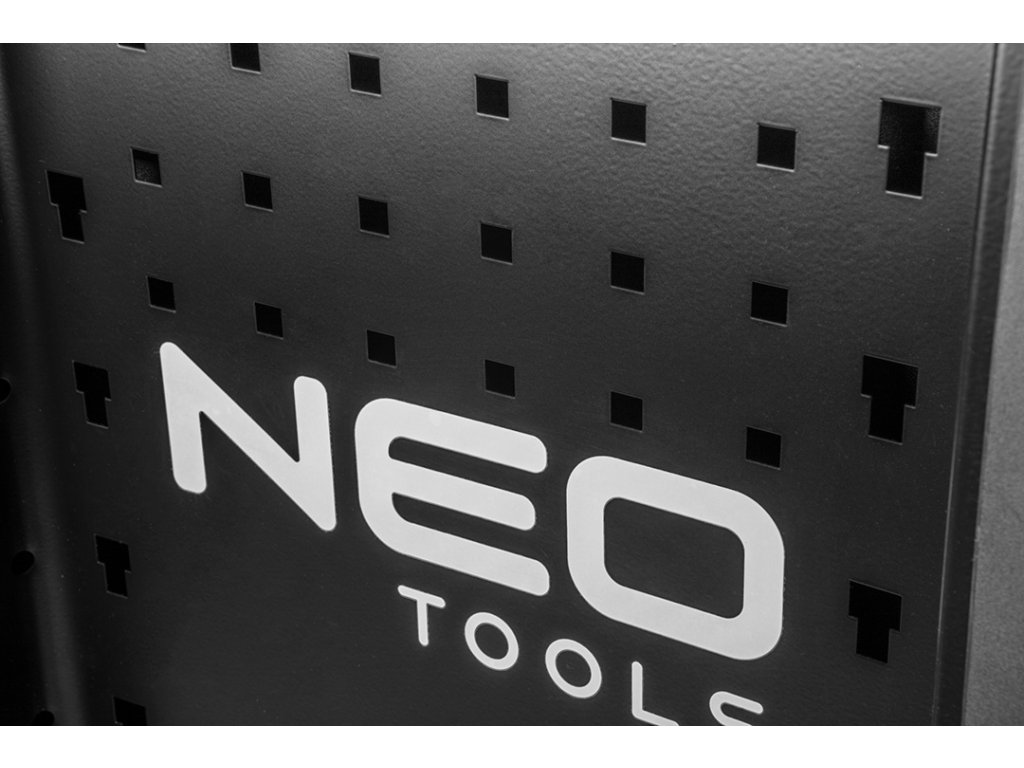 Skriňa na náradie NEO (ref. 84-220) s rozmermi 775 x 465 x 978 mm. Skriňa má 7 praktických zásuviek na náradie uzamykateľných centrálnym zámkom. Všetky zásuvky sú plne otvárateľné a majú guľôčkové výsuvy, ktoré zabezpečujú dlhodobo hladký a spoľahlivý chod. Zásuvky sú zabezpečené spúšťacím zámkom, ktorý chráni okolie počas prepravy. Široká pracovná doska z odolného hliníka spolu s výklenkami na drobné predmety a vyhradeným priestorom na skrutkovače zvyšujú použiteľnosť výrobku. Päťpalcové tiché otočné kolieska uľahčujú manévrovanie so skriňou a sú navyše vybavené brzdou. Nosnosť skrine 300 kg. Skriňa je vybavená pohodlnou rukoväťou na jednoduchú manipuláciu. Spoľahlivosť výrobku potvrdzuje 25-ročná záruka. Značka NEO spĺňa očakávania profesionálov.