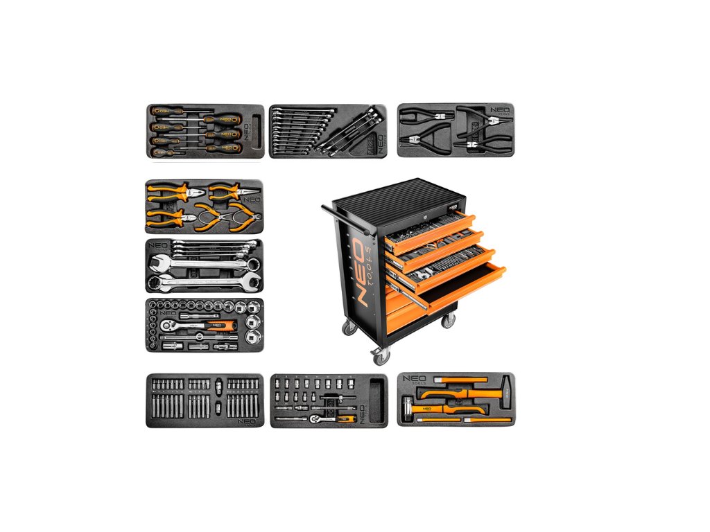 Dielenská skriňa, 7 zásuviek + 129 kusov náradia 84-222-9 od spoločnosti NEO TOOLS je skriňa na príslušenstvo s rozmermi 680 x 460 x 1030 mm a nosnosťou 280 kg. Má robustné oceľové telo, centrálne zamykanie, gumové obloženie na hornej strane a výsuvy s guličkovými ložiskami. Vďaka kolieskam s veľkým priemerom 125 mm a bočnej rukoväti sa ľahko prepravuje. Obsah je zabezpečený centrálnym zámkom. Skriňa sa ponúka s vybranými vložkami s číslami dielov: Ide o optimálnu súpravu NEO TOOLS obsahujúcu potrebné náradie na mechanické opravy. Dielenská skriňa s obsahom odporúčaným pre profesionálov a domácich majstrov.