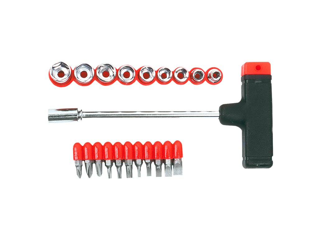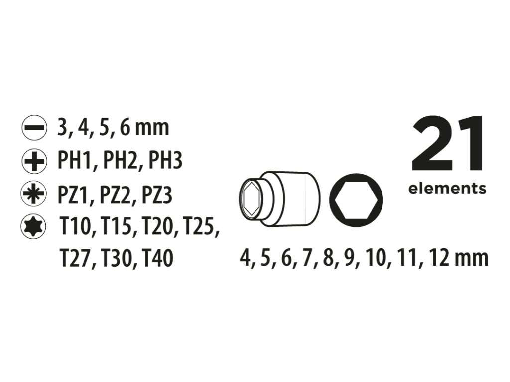 Skrutkovacie bity a nástrčné hlavice s rukoväťou, sada 21 kusov, T-rukoväť, veľkosti skrutkovacích bitov: ploché 3, 4, 5, 6, PH 1, 2, 3, PZ 1, 2, 3, adaptér, veľkosti šesťhranných nástrčiek: 4, 5, 6, 7, 8, 9, 10, 11, 12 mm