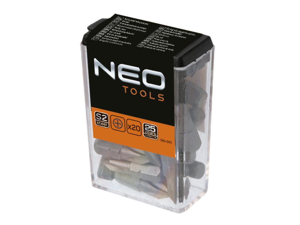NEO skrutkovacie bity PH2 (ref. 06-011) 1/4", dĺžka 25 mm, 20 kusov v súprave. Vďaka použitiu legovanej ocele S2 je tvrdosť bitov 60 HRC, čo výrazne predlžuje ich životnosť a kvalitu práce. Vyrobené podľa normy DIN 3126. 25-ročná záruka výrobcu potvrdzuje vysokú kvalitu náradia. Značka NEO spĺňa očakávania profesionálov.
