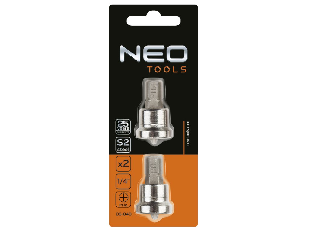 NEO skrutkovacie bity PH2 (ref. 06-040) na sadrokartón, 1/4", dĺžka 25 mm, 2 kusy v sade. Vďaka použitiu legovanej ocele S2 je tvrdosť bitov 60 HRC, čo výrazne predlžuje ich životnosť a kvalitu práce. Záruka výrobcu 25 rokov potvrdzuje vysokú kvalitu náradia. Značka NEO spĺňa očakávania profesionálov.
