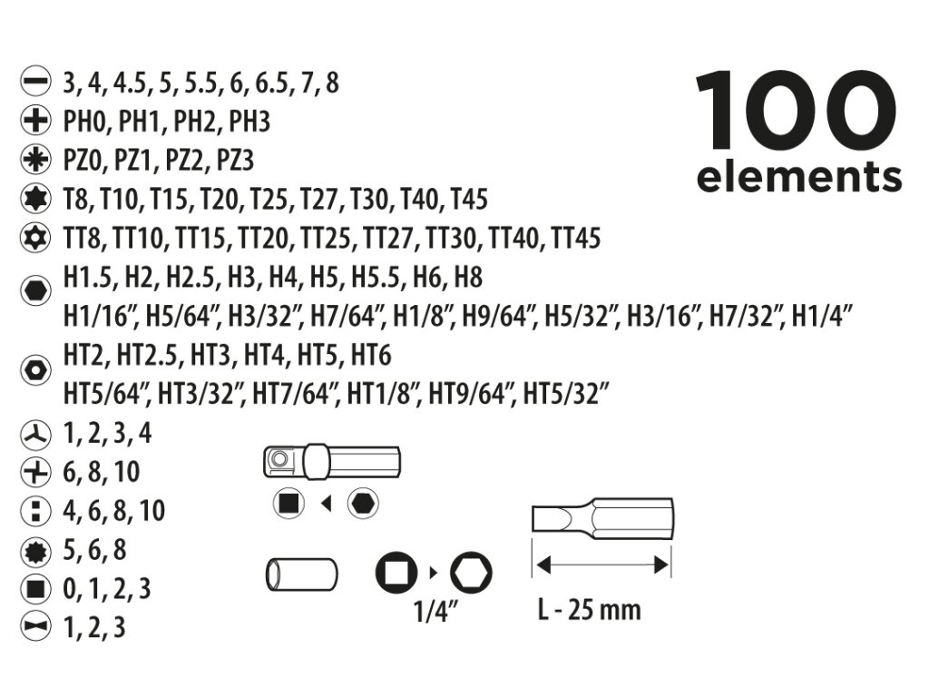 Skrutkovacie bity s rukoväťou, 1/4", sada 100 ks, CrV, dĺžka bitu a zásuvky 25 mm, veľkosti bitov: ploché 3, 4, 4,5, 5, 5,5, 6, 6,5, 7, 8, PH 0, 1, 2, 3, PZ 0, 1, 2, 3, Torx 8, 10, 15, 20, 25, 27, 30, 40, 45, Torx s otvorom 8, 10, 15, 20, 25, 27, 30, 40, 45, Hex 1.5, 2, 2,5, 3, 4, 5, 5,5, 6, 8, 1/16", 5/64", 3/32", 7/64", 1/8", 9/64", 5/32", 3/16", 7/32", 1/4", HEX dierovanie 2, 2.5, 3, 4, 5, 6, 5/64", 3/32", 7/64", 1/8", 9/64", 5/32", trojkrídlové 1, 2, 3, 4, štvorkrídlové 6, 8, 10, servisný bit 4, 6, 8, 10, drážkový 5, 6, 8, štvorhranný bit 0, 1, 2, 3, dvojkrídlové 1, 2, 3.
