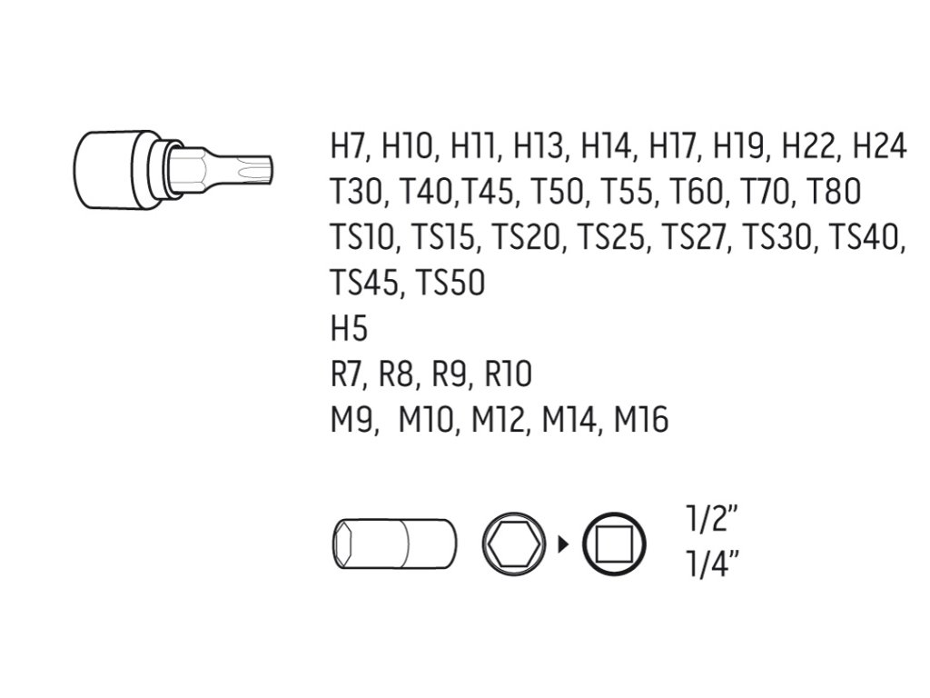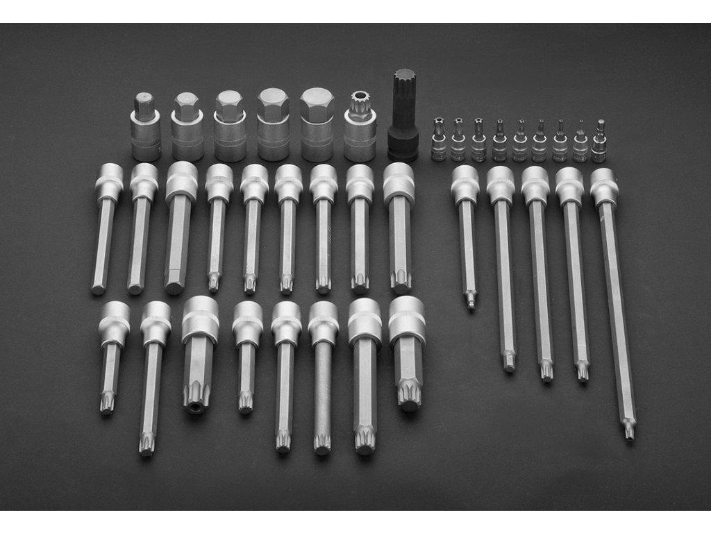 Sada bitov Torx 1/2" 38 ks. 1/2", 140 mm Torx, T40, T45, T50, T55, T60, T70, T80x100 mm - s otvorom, 1/2", drážkový, M9x100 mm, M10x140 mm, M12x140 mm, M14x140 mm, M16x100 mm, 1/2", drážkový, s otvorom, (TAMPER PROOF) M16x55 mm, 1/2", rázová drážka, M18 x 75 mm, 1/2", Ribe, R7x240 mm, R8x240 mm, R9x100 mm, R10x140 mm, 1/2", šesťhranná (HEX) s guľatou hlavou, H5 x 160 mm, 1/2" šesťhranné (HEX), H10x140 mm, H11x140 mm, H13x140 mm, H7x230 mm, 1/2", šesťhranné (HEX) 50 mm, H14, H17, H19, H22, H24, 1/4", päťhranné (STAR) s otvorom (Tamper Proof) TS10, TS15, TS20, TS25, TS27, TS30, TS40, TS45, TS50, 1/2", päťhranné (STAR) s otvorom (Tamper Proof), TS30x300 mm, nástrčné hlavice z CrV ocele, bity z ocele S2, certifikované TÜV M+T.