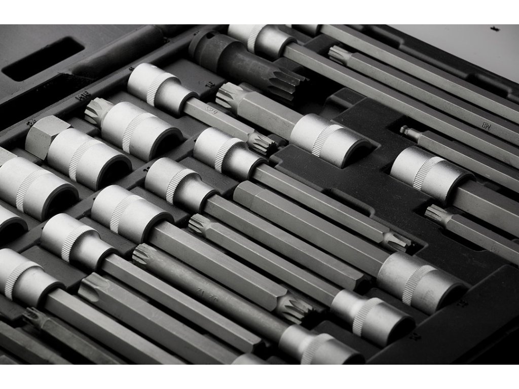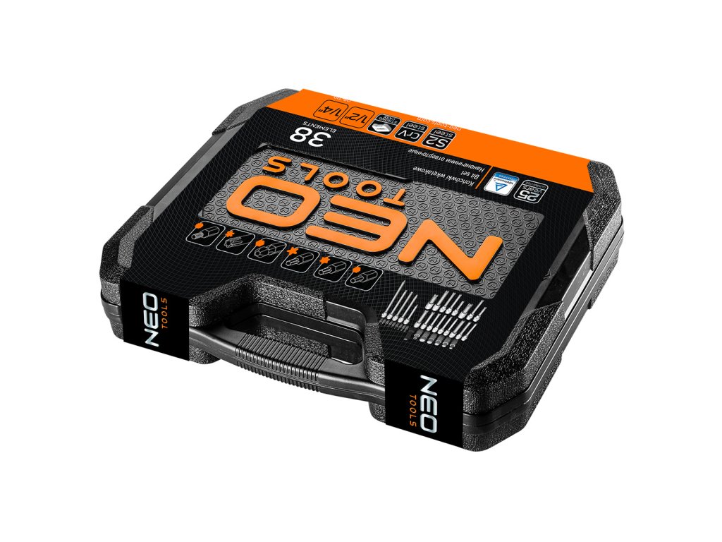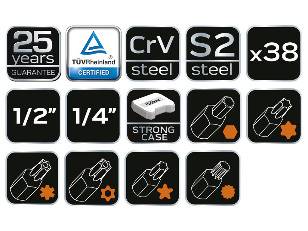 Bity NEO 1/2" Torx (ref. 08-710). Sada obsahuje 38 kusov bitov a nástrčných hlavíc Torx, ktoré sa používajú najmä pri servise automobilov populárnych značiek. Sada obsahuje širokú škálu špecializovaných nástrčných hlavíc a bitovTorx, Hex, Ribe, Star a Spline 18 mm rázové nástrčné hlavice. Všetky prvky sú vyrobené z odolnej chróm-vanádiovej ocele, ktorá zaručuje dlhoročnú životnosť. Celá súprava sa dodáva v pevnom a praktickom plastovom kufríku. Kvalita nástroja potvrdená certifikátom TÜV. Značka NEO spĺňa očakávania profesionálov.