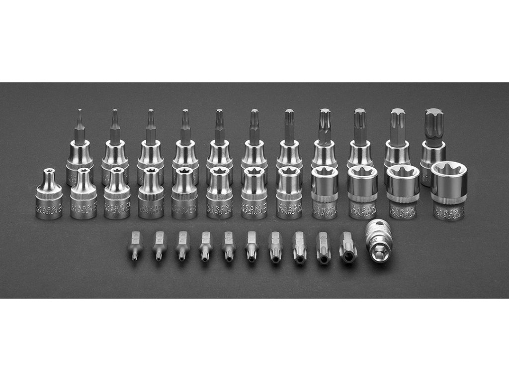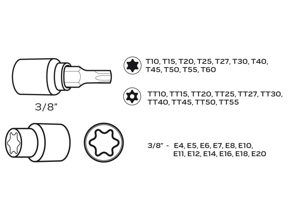 Sada bitov Torx 3/8" 34 kusov, Nástrčné hlavice E-Torx: E4-5-6-7-8-10-11-12-14-16-18-20, bity na nástrčnej hlavici Torx: T10-15-20-25-27-30-40-45-50-55-60, bity s otvorom Torx (Tamper Proof): T10-15-20-25-27-30-40-45-50-55, adaptér na bity - 8 mm, nástrčné hlavice z CrV ocele, bity z ocele S2, certifikát TÜV M+T, záruka 25 rokov