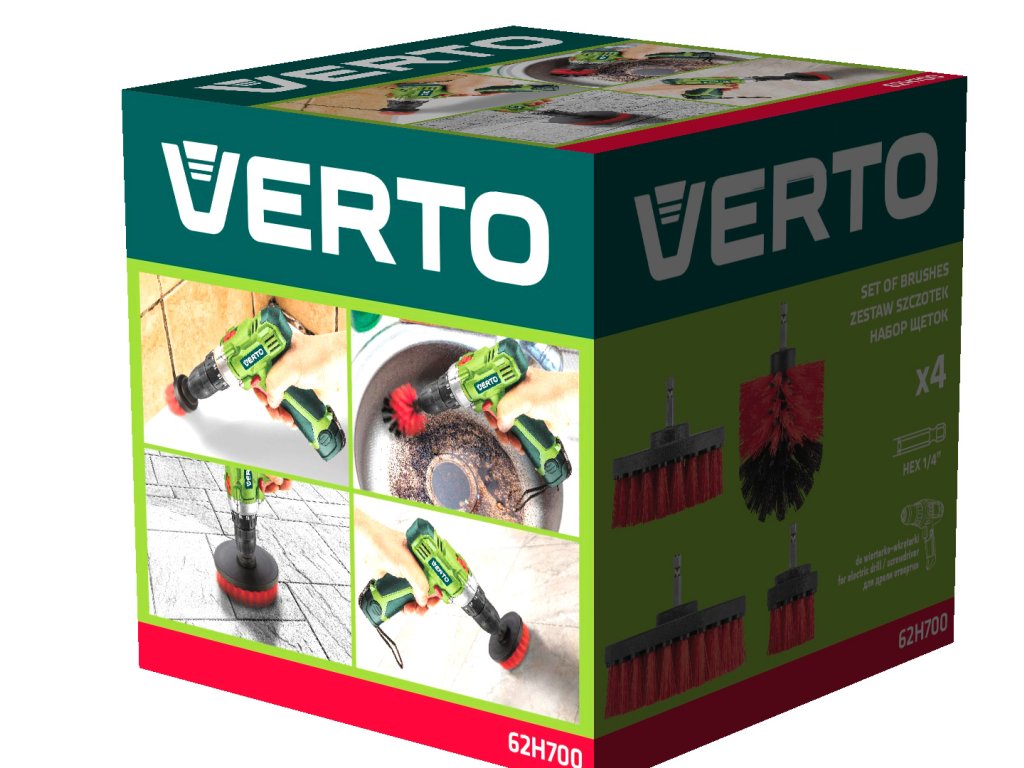 Čistiace kefy VERTO (ref. 62H700) s priemerom 50, 90, 100, 130 mm, so šesťhranným uchytením sa dajú použiť s každou vŕtačkou alebo skrutkovačom. Táto viacúčelová súprava nájde široké využitie doma, v dielni alebo v aute. Hlavice sú prispôsobené na čistenie rovných povrchov, ako je linoleum, tehla, podlahy, ale aj na všetky druhy škárovacej hmoty, obkladačky, kúpeľňové armatúry, drezy, plynové sporáky, skrine, pulty, koberce, rohože do auta, ráfiky, stojany, spoje. Rôzne tvary hláv umožňujú prácu na ťažko prístupných miestach. Kefy výrazne urýchľujú čistenie znečistených povrchov a vďaka strednej tvrdosti štetín ich nepoškodzujú. V závislosti od vykonávanej činnosti sú určené na mokré a suché použitie. Značka VERTO ponúka sortiment elektrického náradia a príslušenstva pre každého domáceho majstra.