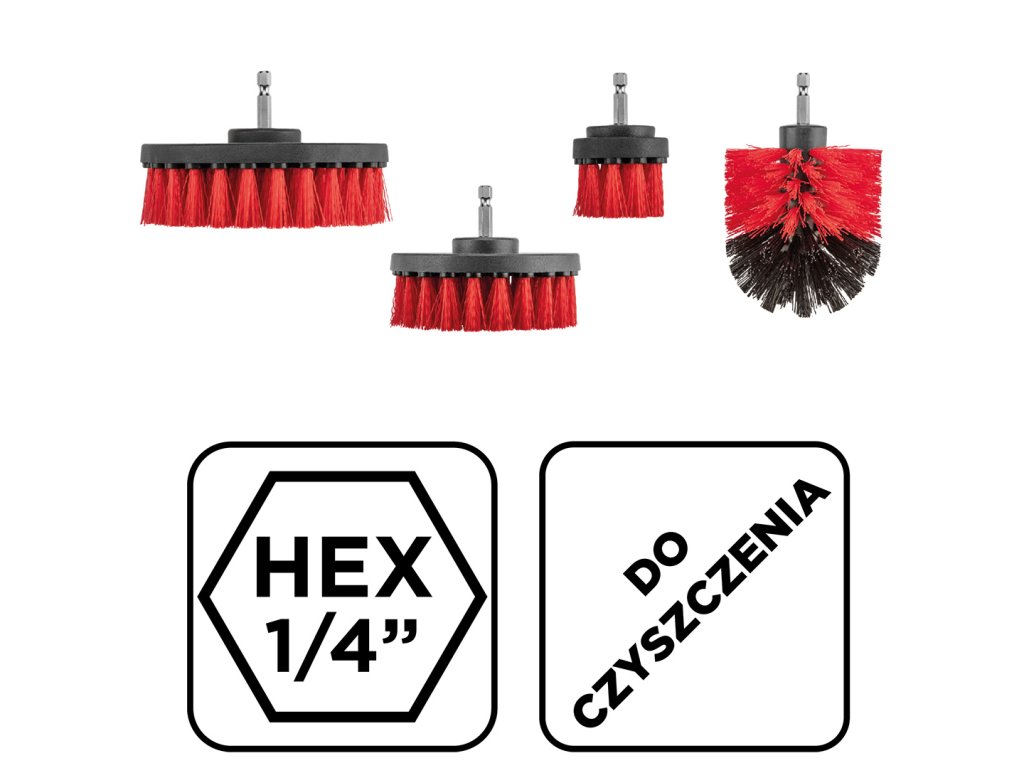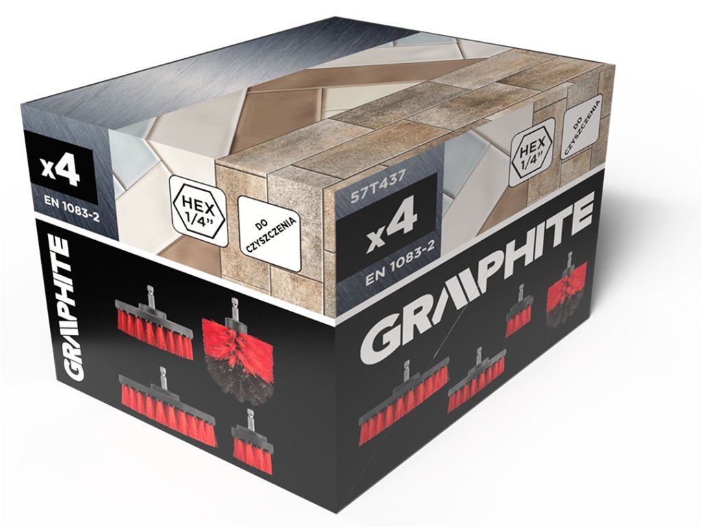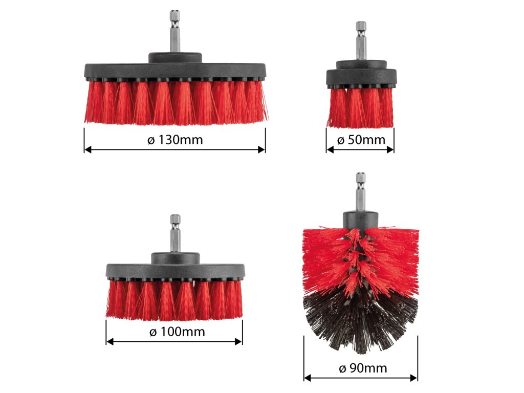 Čistiace kefy na vŕtačku, 4 kusy 57T437 od spoločnosti GRAPHITE sú štyri kefy s priemermi 50 mm, 90 mm, 100 mm a 130 mm. Upevňujú sa pomocou univerzálneho 1/4" skľučovadla HEX. Kefy sú určené na použitie s každou vŕtačkou alebo skrutkovačom. Rôzne tvary hlavíc im umožňujú pracovať na rôznych povrchoch a dosiahnuť do ťažko prístupných miest. Sú vhodné na mokré alebo suché čistenie. Stredne tvrdé štetiny účinne odstraňujú nečistoty bez poškodenia povrchu. Kefy značky GRAPHITE sa používajú v domácnosti, dielni, garáži a aute