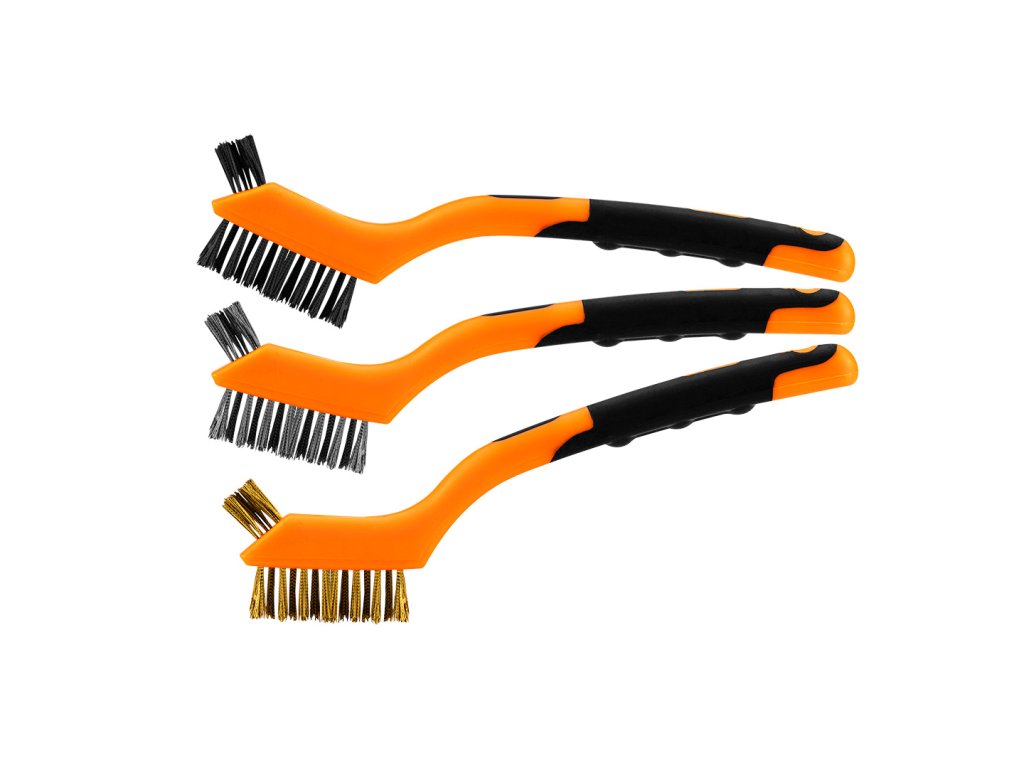 Drôtené kefy NEO sú súpravou 3 kief: oceľovej (2), mosadznej (1) a nylonovej (3). Oceľové a mosadzné kefy sa používajú na čistenie povrchov od obzvlášť odolných nečistôt a nylonové na odstránenie ľahších nečistôt. Dvojzložková protišmyková rukoväť zabraňuje vykĺznutiu produktu z ruky.