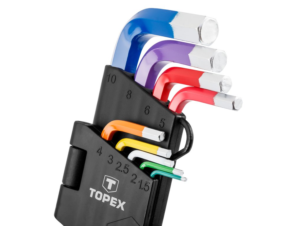 Sada šesťhranných kľúčov TOPEX (ref. 35D966) obsahuje 9 kľúčov vo veľkostiach od 1,5 do 10 mm z odolnej chróm-vanádiovej ocele. Každá veľkosť kľúča je označená inou farbou, čo uľahčuje rýchly výber správnej veľkosti počas práce. Všetko je zabalené v praktickom balení. Značka TOPEX je určená pre domácich majstrov.