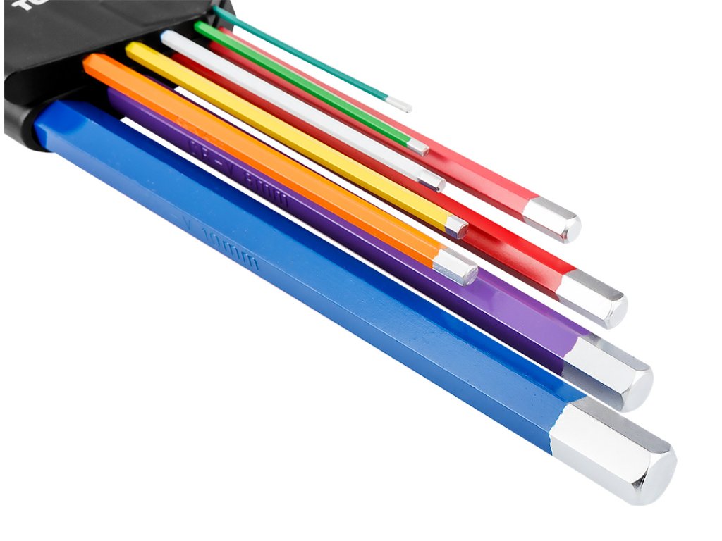 Šesťhranné kľúče 1,5 - 10 mm, sada 9 kusov, s rukoväťou, CrV oceľ, veľkosti: 1,5, 2, 2,5, 3, 4, 5, 6, 8, 10 mm, veľkosti farebne kódované
